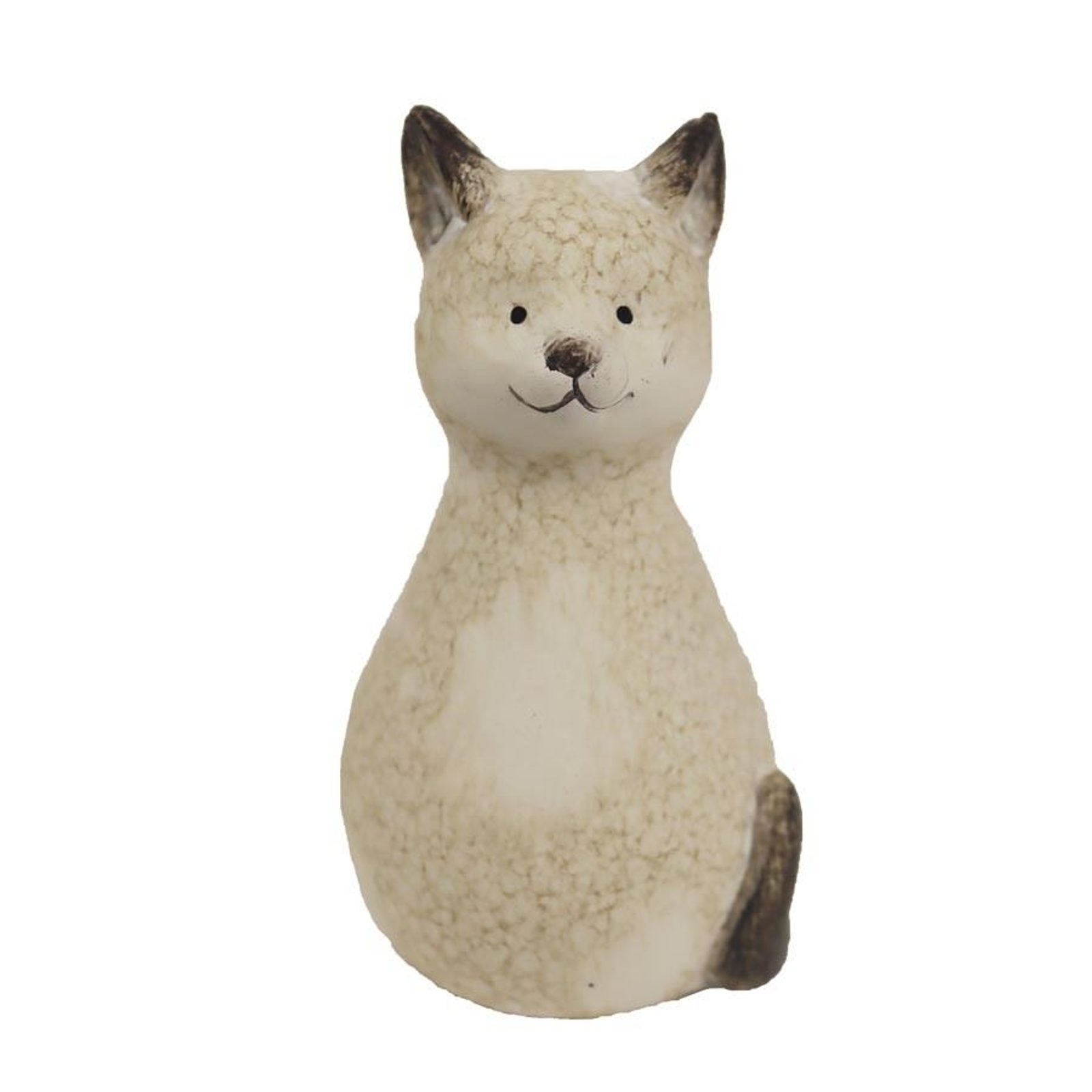 Dekorační kočka. Rozměry : 6,6 x 6 cm, výška 11,7 cm. Barva : kombinace krémová, hnědá. Materiál : terakota.Rozměr: 6.6 × 6 × 11.7 cm