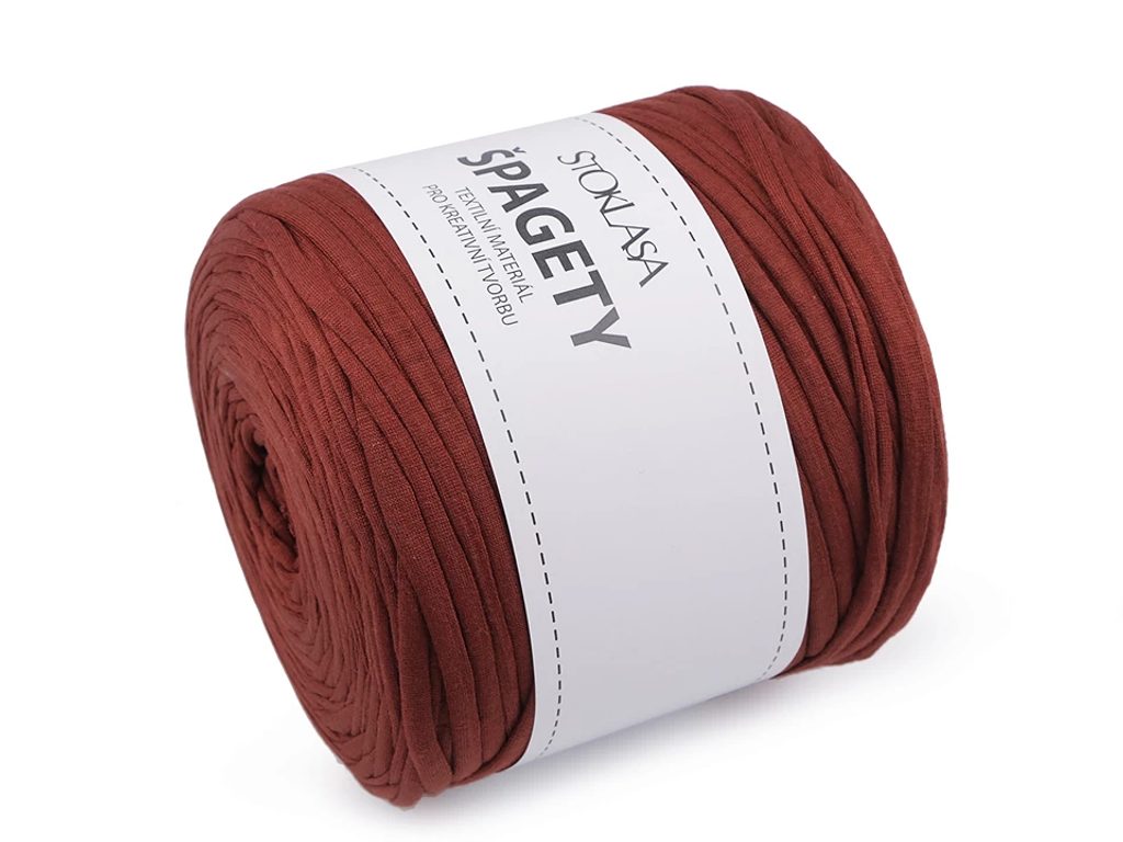 Špagetovou přízi tvoří nařezané proužky látky z recyklované bavlny. Příze je mírně elastická. Využijete ji na pletení a háčkování koberečků, dek, tašek, šál, košíků, batohů, povlaků na polštáře apod. Je příjemná na dotek, vhodná i k pletení rukama.