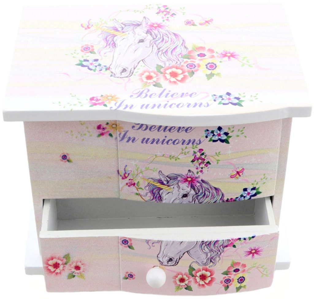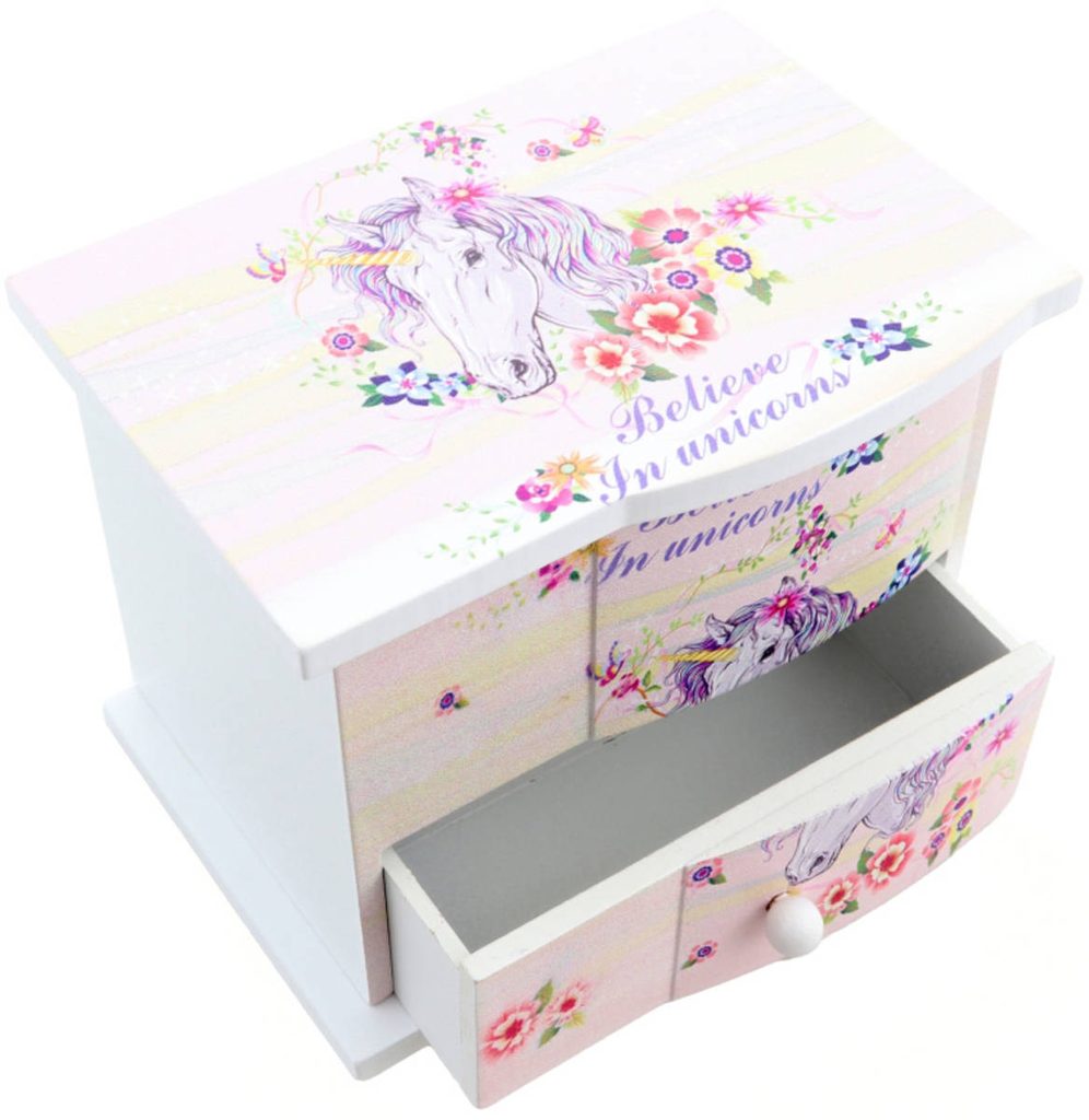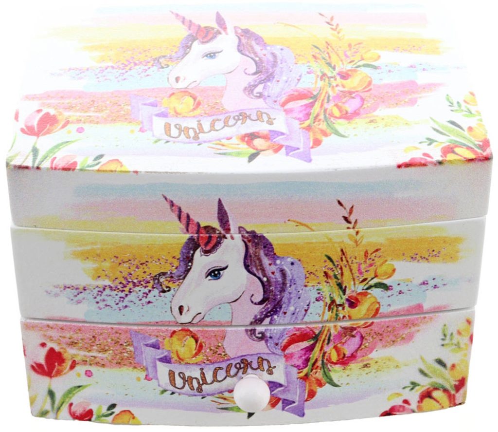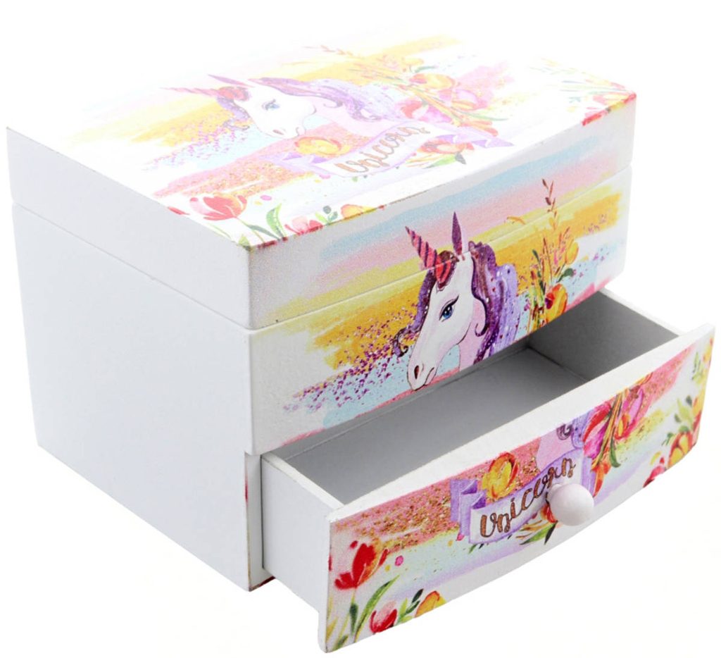 DŘEVO Šperkovnice jednorožec s melodií se zrcátkem na natažení