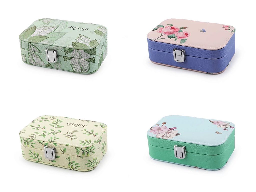 Malá šperkovnice s potiskem přírodních motivů má kovové zapínání, spolehlivě ochrání šperky před nepříznivými vlivy okolí jako je světlo nebo vlhkost. Uvnitř šperkovnice jsou 2 přihrádky s polštářky na náušnice, oddíl na prsteny a zrcátko. Šperkovnice má velice kvalitní a precizní provedení.