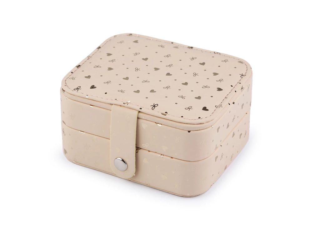 Malá šperkovnice se 2 patry má povrch ozdobený lesklým potiskem srdcí a mašliček. Disponuje velkým množstvím úložného prostoru. Zapínání na patent, spolehlivě sepne obě patra dohromady. Je perfektní na doma i na cestování.V horním patře najdete 3 přihrádky s odnímatelnými přepážkami na náušnice. Do dolního patra můžete odkládat prsteny, náušnice a jiné drobné šperky. V horním víku je umístěné zrcátko, v dolním 3 háčky. Šperkovnice má velice kvalitní a precizní provedení.