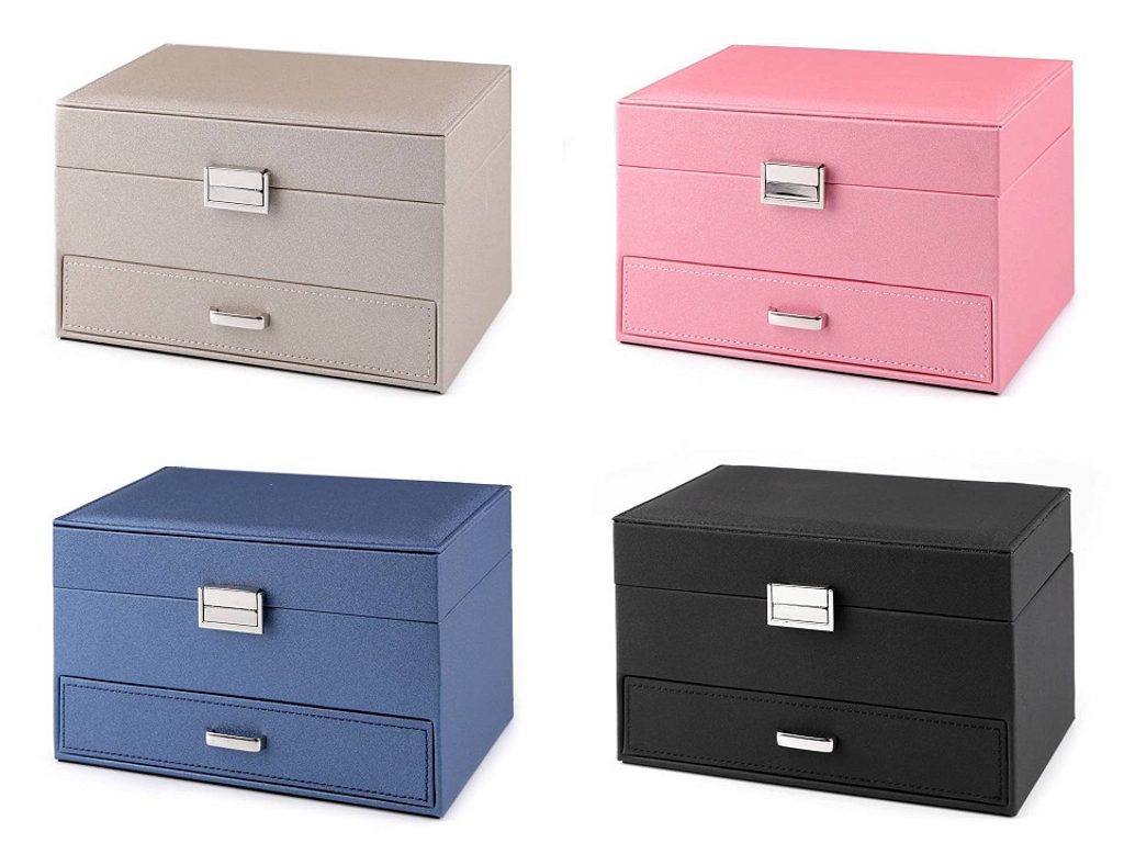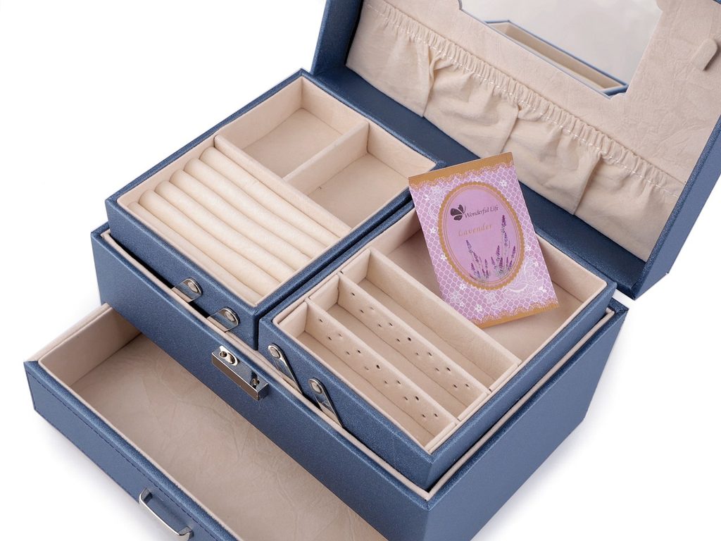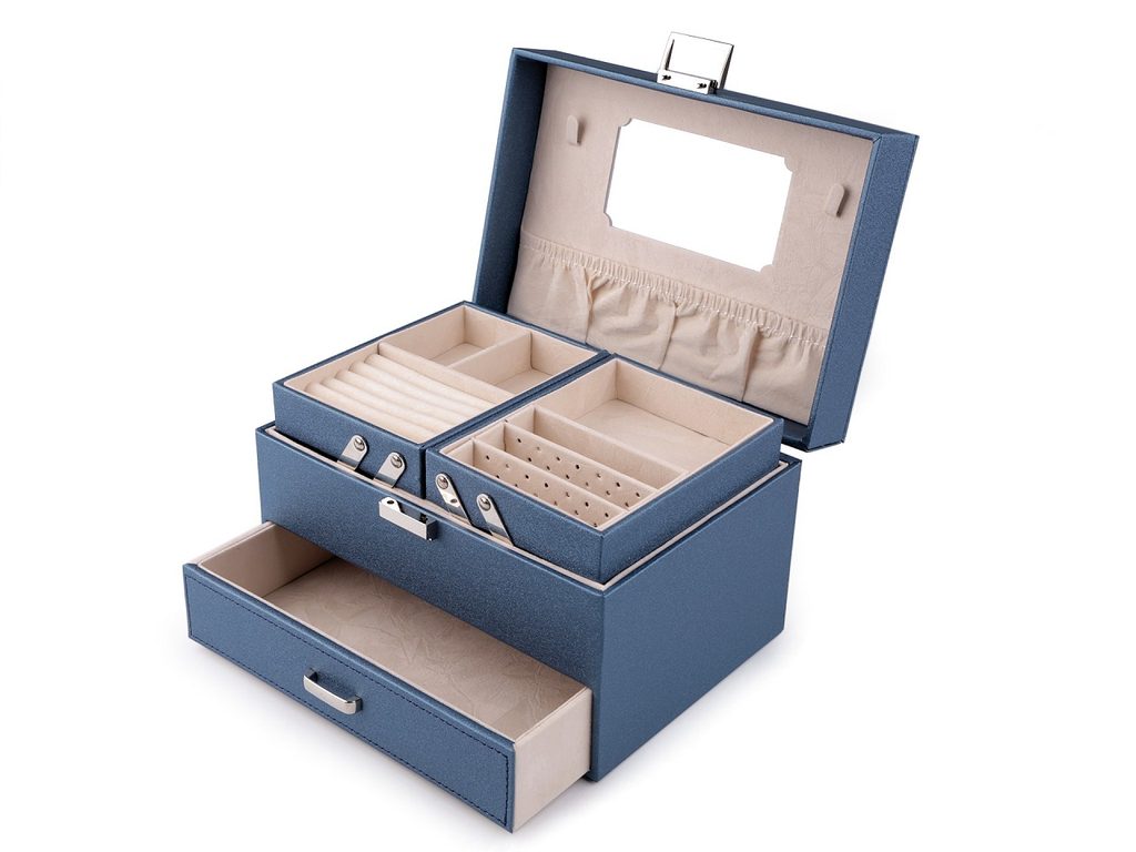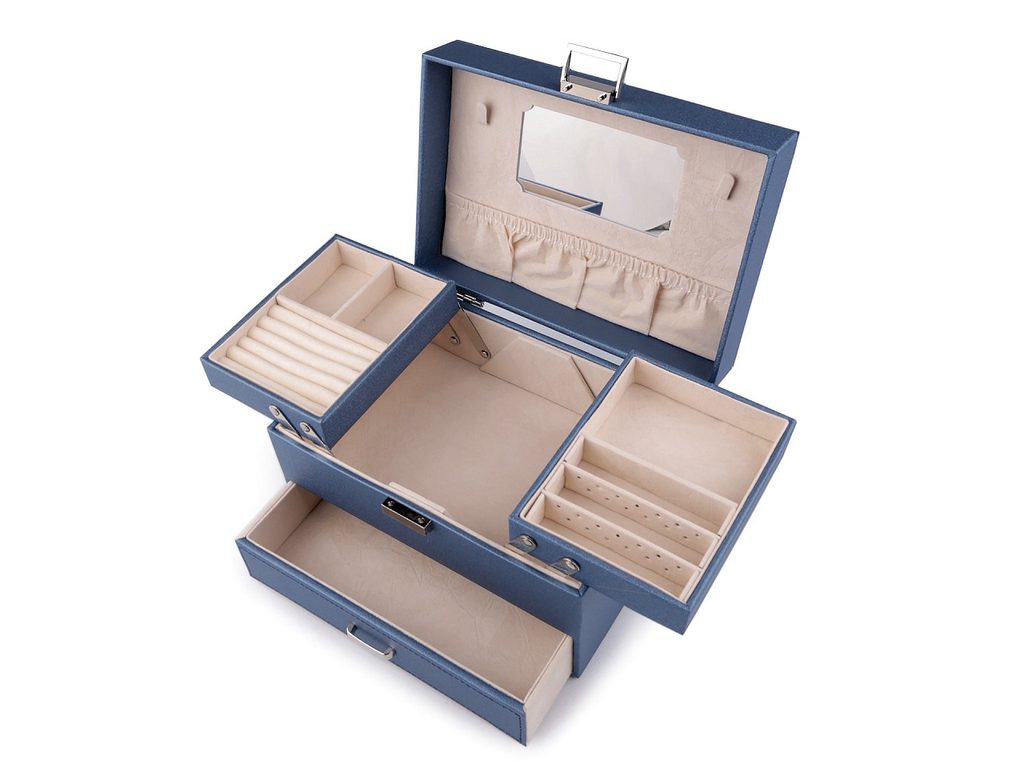 Horní patro se rozkládá do stran. Obsahuje malé přihrádky, oddíl na prsteny a přepážky s dírkami na uložení náušnic. Prostřední patro má jeden velký prostor. Spodní patro tvoří vysunovací šuplík. Ve víku je zrcadlo, 2 háčky a kapsa. Šperkovnice má velice kvalitní a precizní provedení. Vnější potah je polyuretan, uvnitř je semiš.