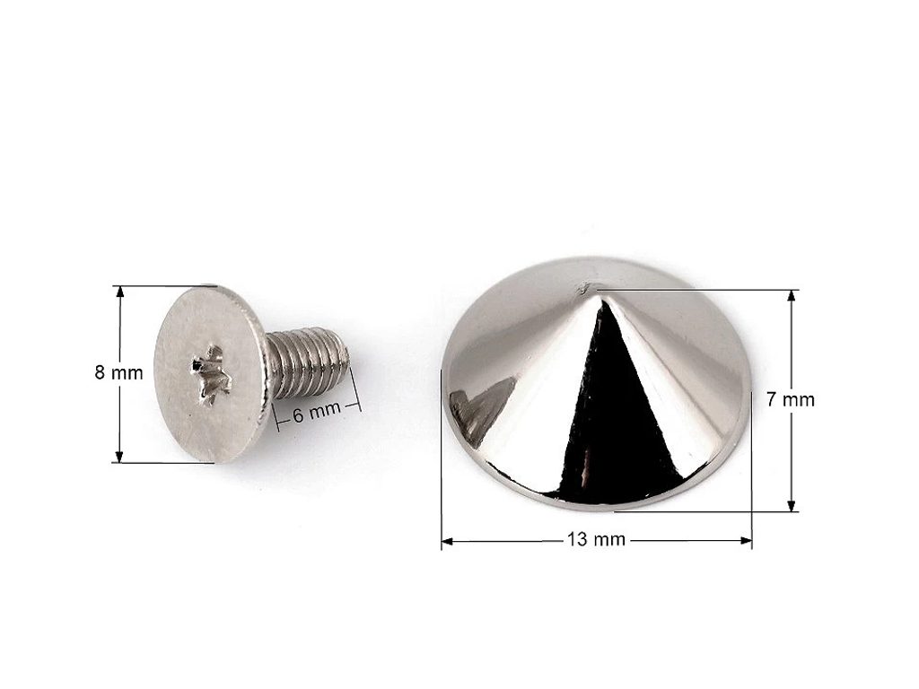 Šroubovací hroty skvěle ozdobí každou kabelku, psaníčko, oděvy, kožené bundy i boty. Skládají se ze dvou částí, které do sebe jednoduše zašroubujete. Můžete je použít i jako nožičky na kabelky.