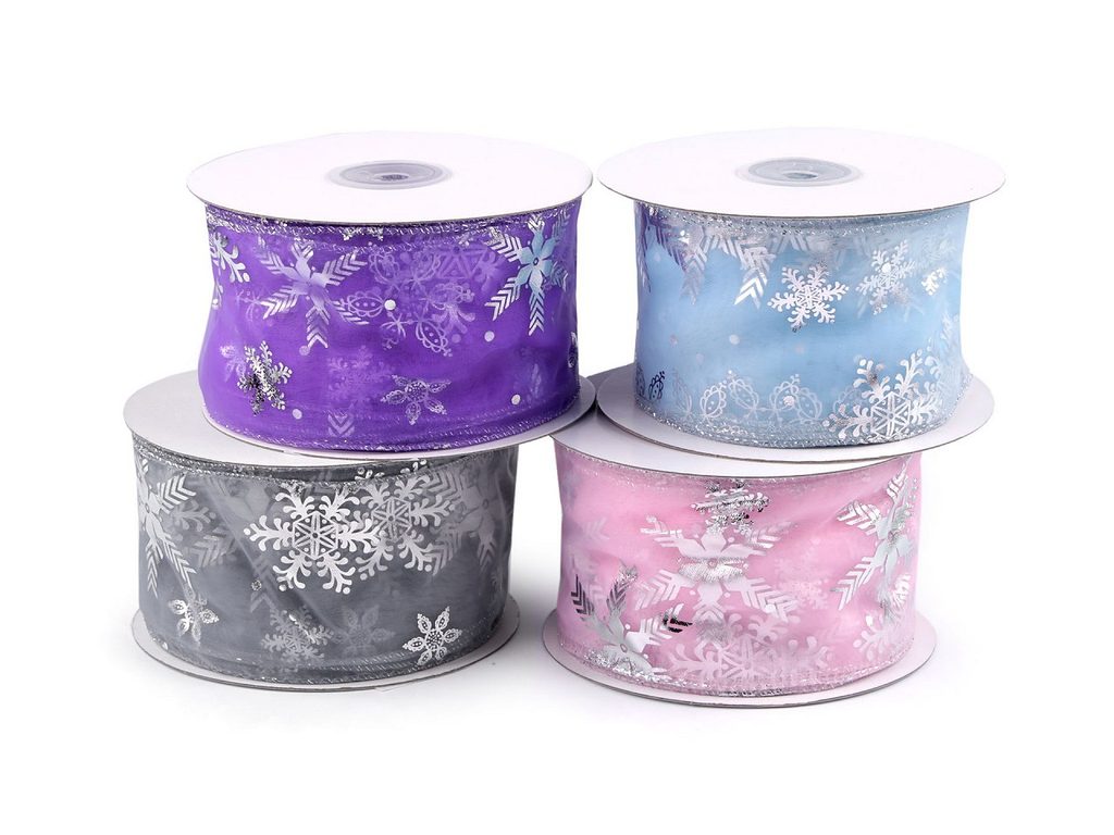 Široká organzová stuha je po stranách obšitá třpytivým lurexem se silonem. Je průsvitná, ozdobená metalickým potiskem sněhových vloček. Potisk je jednostranný, působivě se leskne.