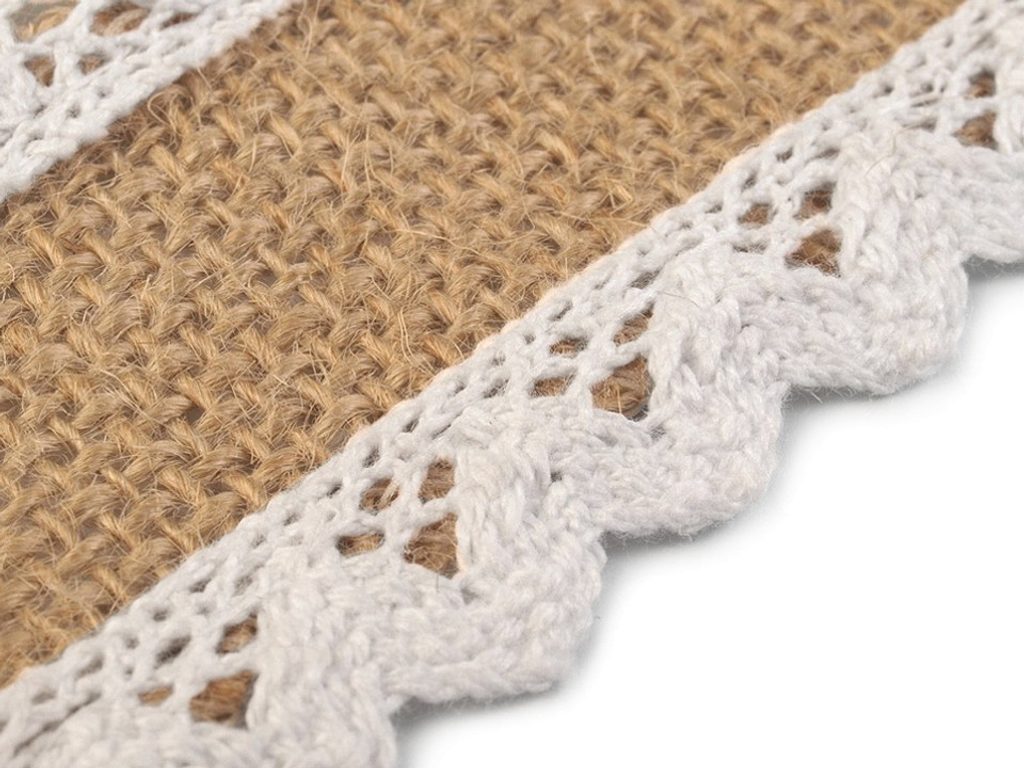 Jutovou stuhu zdobí po obou stranách romantická bavlněná krajka. Stuze propůjčuje starobylý vintage vzhled.