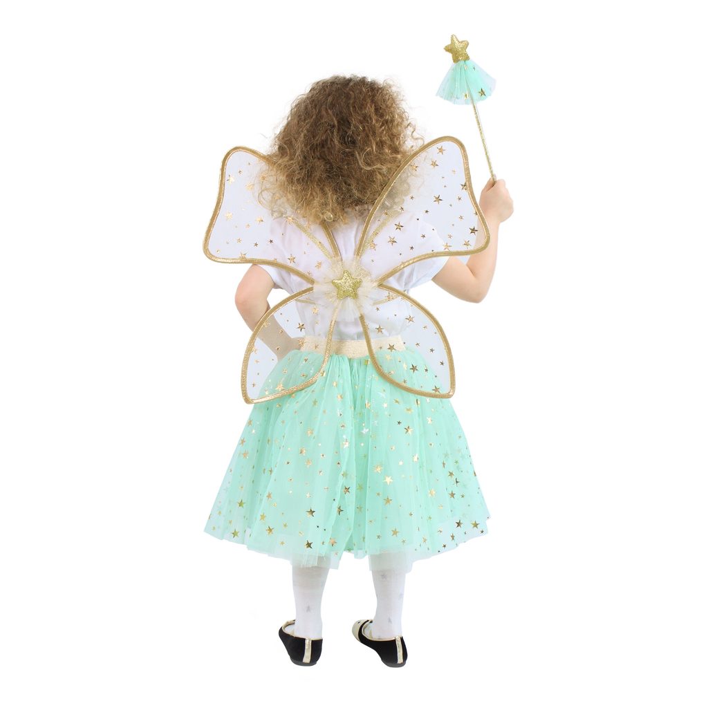 Krásná vílí sada pro malé holčičky! Sada obsahuje zelenou tylovou TUTU sukýnku s potiskem zlatých hvězdiček a zlatou gumou v pase, k tomu perfektně sladěná křídla a hůlku ve stejném motivu. Sukně je dlouhá cca 35 cm a je vhodná pro obvod pasu 50-60 cm. Určeno pro holčičky ve věkovém rozmezí 3-10 let (104-146 cm). Nejen letos je potřeba myslet EKO-nomicky i EKO-logicky! EKO-balení je vhodné zejména pro e-shopy kde zákazník nakupuje dle fotografie a není třeba velkého balení s věšákem. EKO-logicky – na balení bylo použito méně plastu a dalších materiálů. Jedná se o malý transparentní obal s fotografií. EKO-nomicky –EKO-obal zabere jen polovinu místa – šetřete skladová místa s námi!
