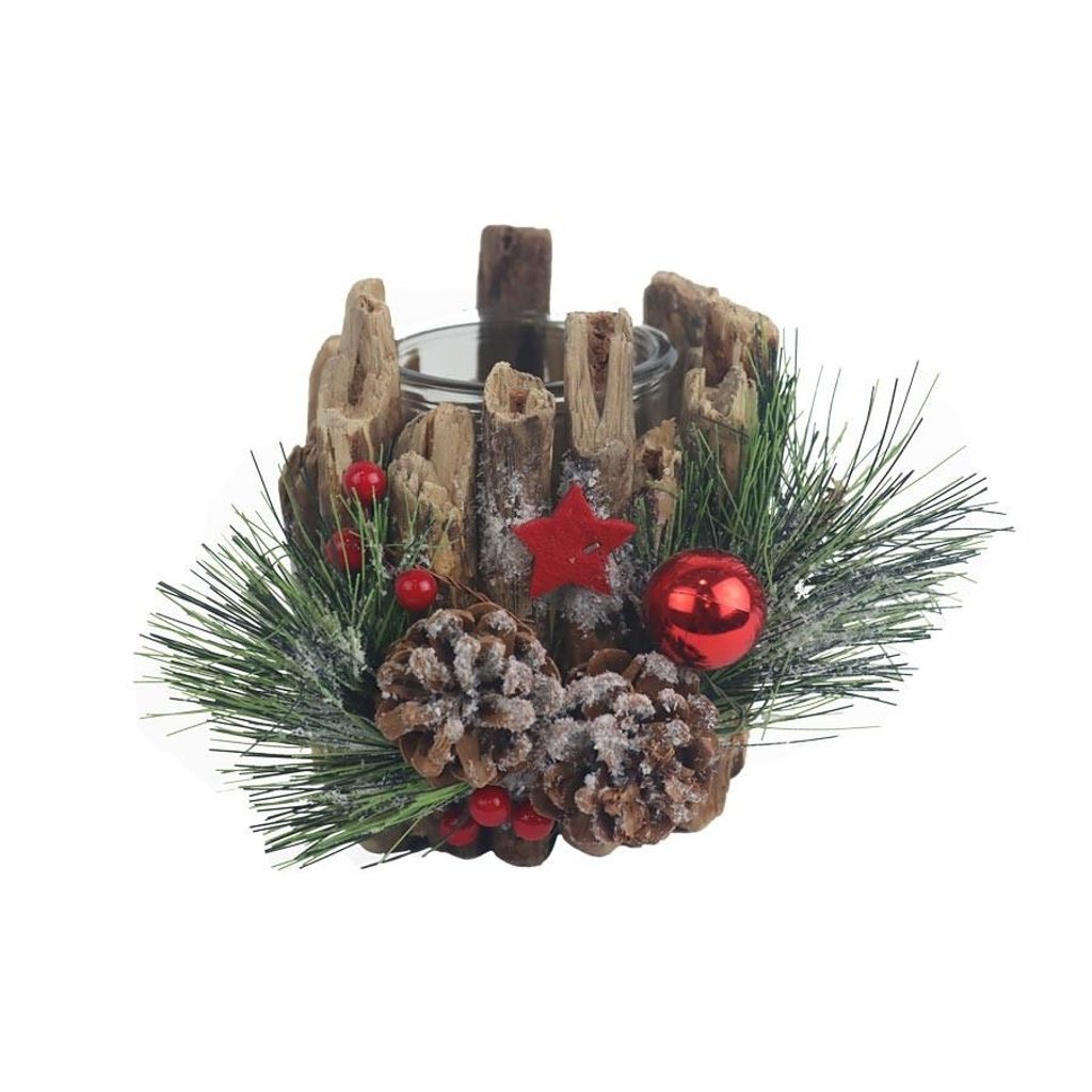 Dekorační svícen na 1 svíčku. Rozměry : 20 x 15 cm, výška 14 cm. Barva : kombinace přírodní, zelená, červená. Materiál na bázi dřeva, plast, sklo.