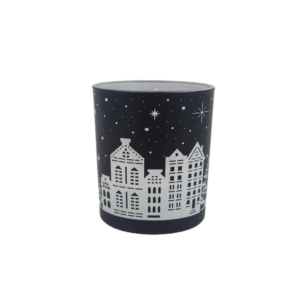 Dekorační svícen. Rozměry : průměr 7 cm, výška 8 cm. Barva : kombinace černá, bílá. Materiál : sklo.
