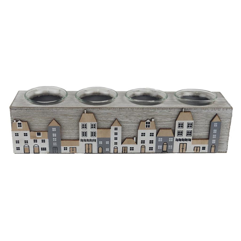 Dekorační svícen na 4 svíčky. Rozměry : 31 × 7 cm, výška 8 cm. Narva : kombinace hnědá, bílá, šedá. Materiál na bázi dřeva, sklo.Rozměr: 31 × 7 × 8 cm