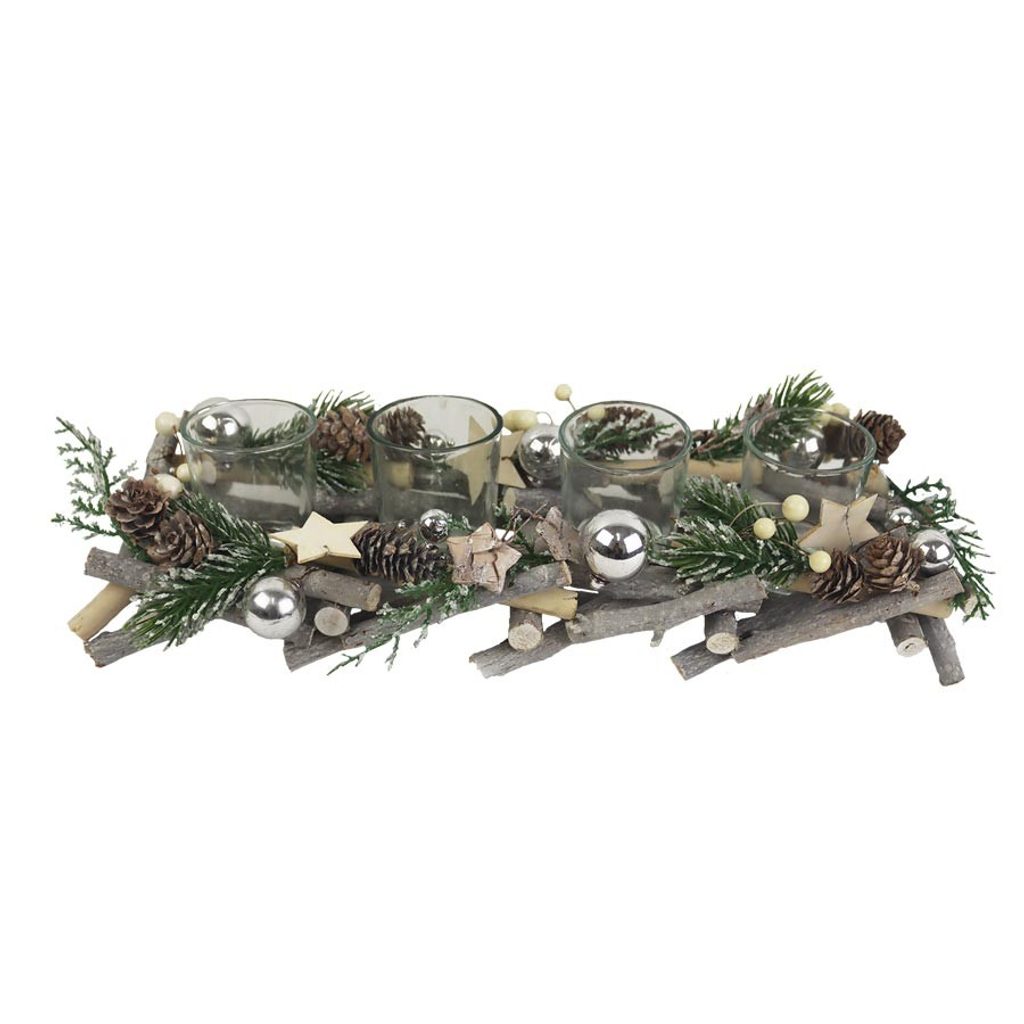 Dekorační adventní svícen. Rozměry : 36 x 13 cm, výška 8 cm. Barva : kombinace přírodní, zelená, bílá. Materiál : přírodní, plast, sklo.