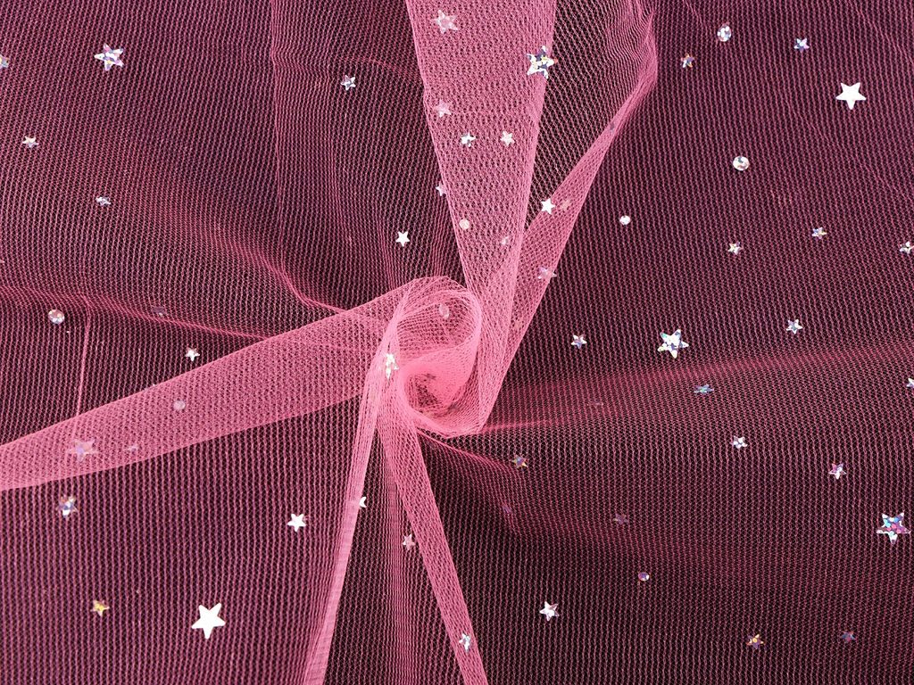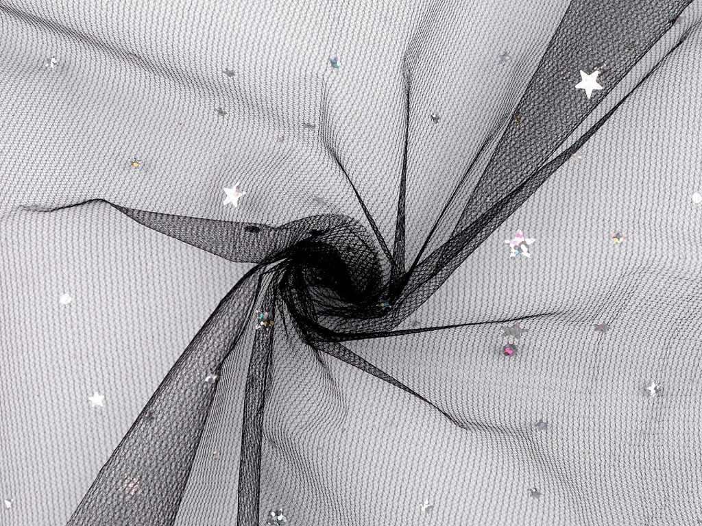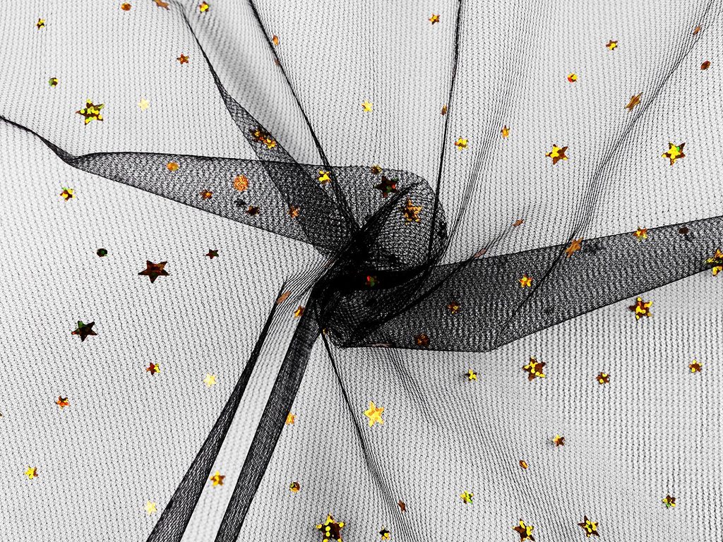 Tyl zdobí hvězdičky a puntíky s hologramem. Využijete ho na karnevaly, kostýmy, šití sukní apod. Je vhodný také na vánoční dekorace.