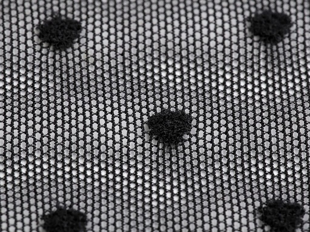 Elastický tyl s puntíky je jemný, splývavý, příjemný na dotek a neškrábe. Používá se k našití na oděvy jako vsadka nebo ozdobný prvek na rukávy, na šaty, halenky, sukně, apod