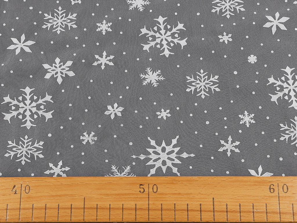 Vánoční tyl zdobí potisk sněhových vloček. Je jemný, měkký a pruží více po šíři. Využijete ho na šití závojů, sukýnek, karnevalových kostýmů i různých dekorací a zimních aranžmá.- Materiál: polyamid 100%