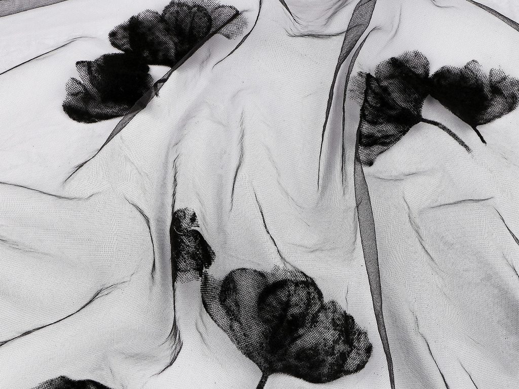 Tyl s listy ginkgo biloby je pružný, jemný a splývavý. Působí luxusně. Vzor listů má sametově hebký efekt. Tyl využijete na šití společenských a večerních šatů, sukní, elegantních halenek, bolerek, šálů apod.Dobře a rychle schne.