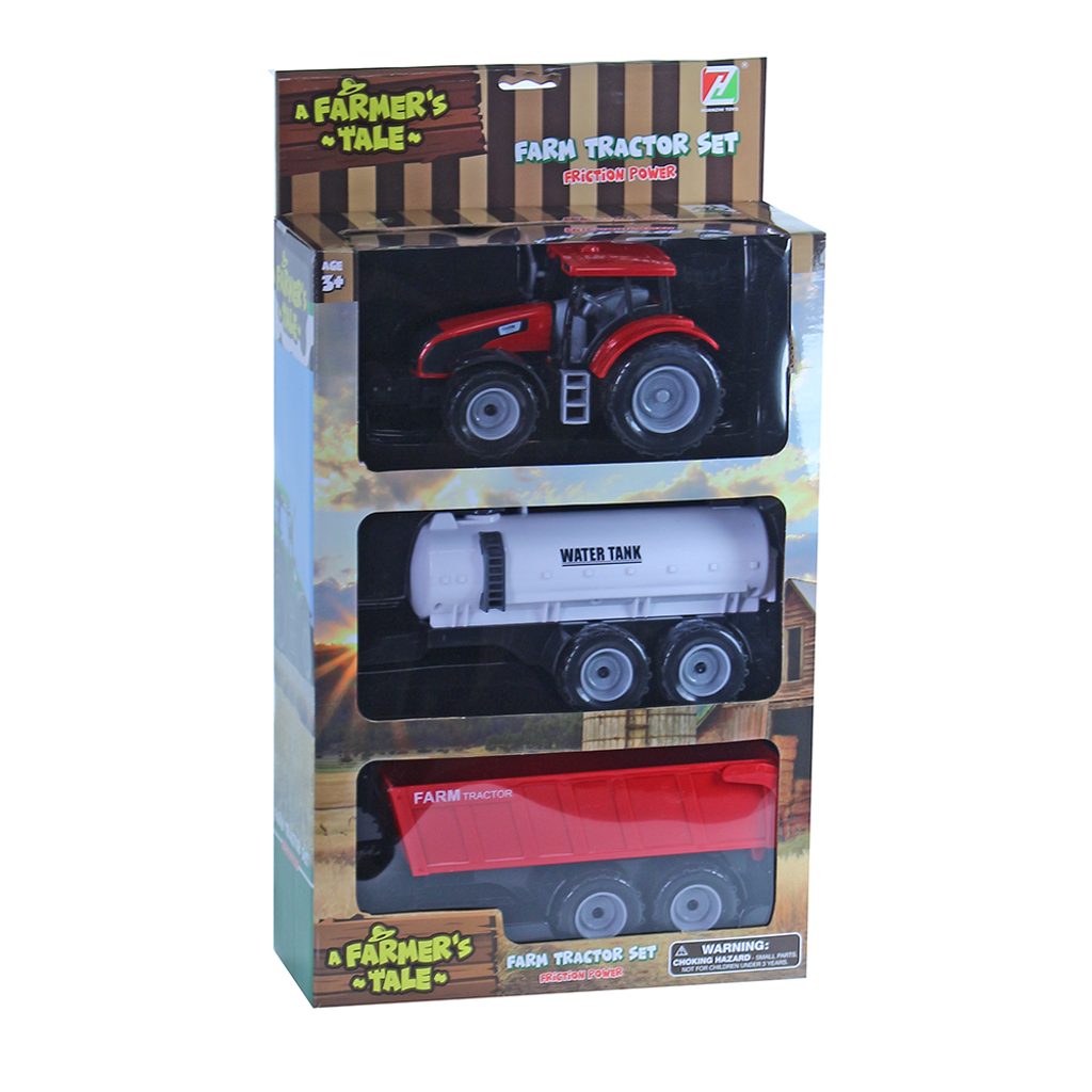 Parádní sada pro malé farmáře. Obsahuje plastový traktor, který jezdí na setrvačník, vlečku a cisternu na vodu. Už si jen vybrat barvu - červenou či zelenou?