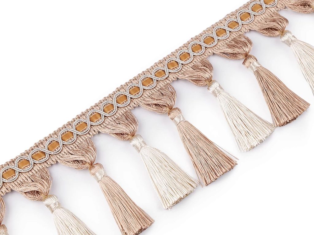 Prýmek s lesklými střapci je vhodný k ozdobení závěsů či k olemování nábytku (křesel, pohovek apod.). Horní částí je provlečená sametová stuha.
