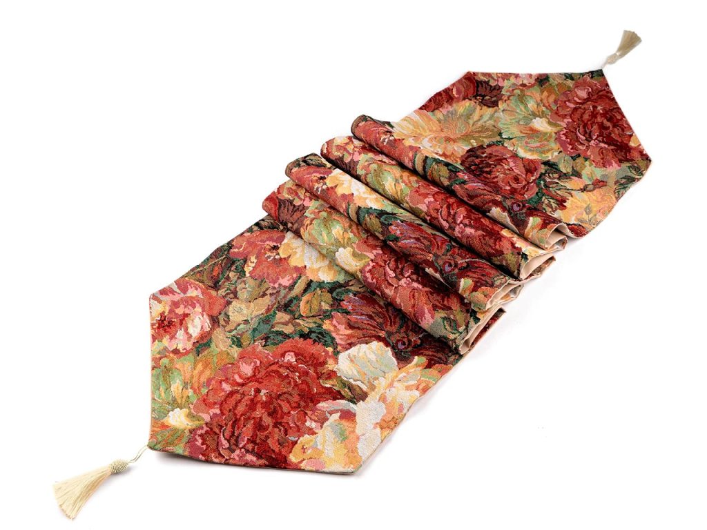 Textilní běhoun působí jako by byl vyšívaný gobelínovým stehem. Poslouží k ozdobení středové části stolu. Se svými květinovými motivy se hodí pro celoroční použití. Můžete jej použít na jídelní stůl pro vytvoření útulné atmosféry při večeři s rodinou nebo přáteli, je rovněž skvělou volbou pro sváteční stůl při oslavách, kdy dodá interiéru slavnostní vzhled. Na obou koncích má našitý lesklý střapec. Je kvalitní, velice pevný, podšitý.Délka je měřená bez střapců.