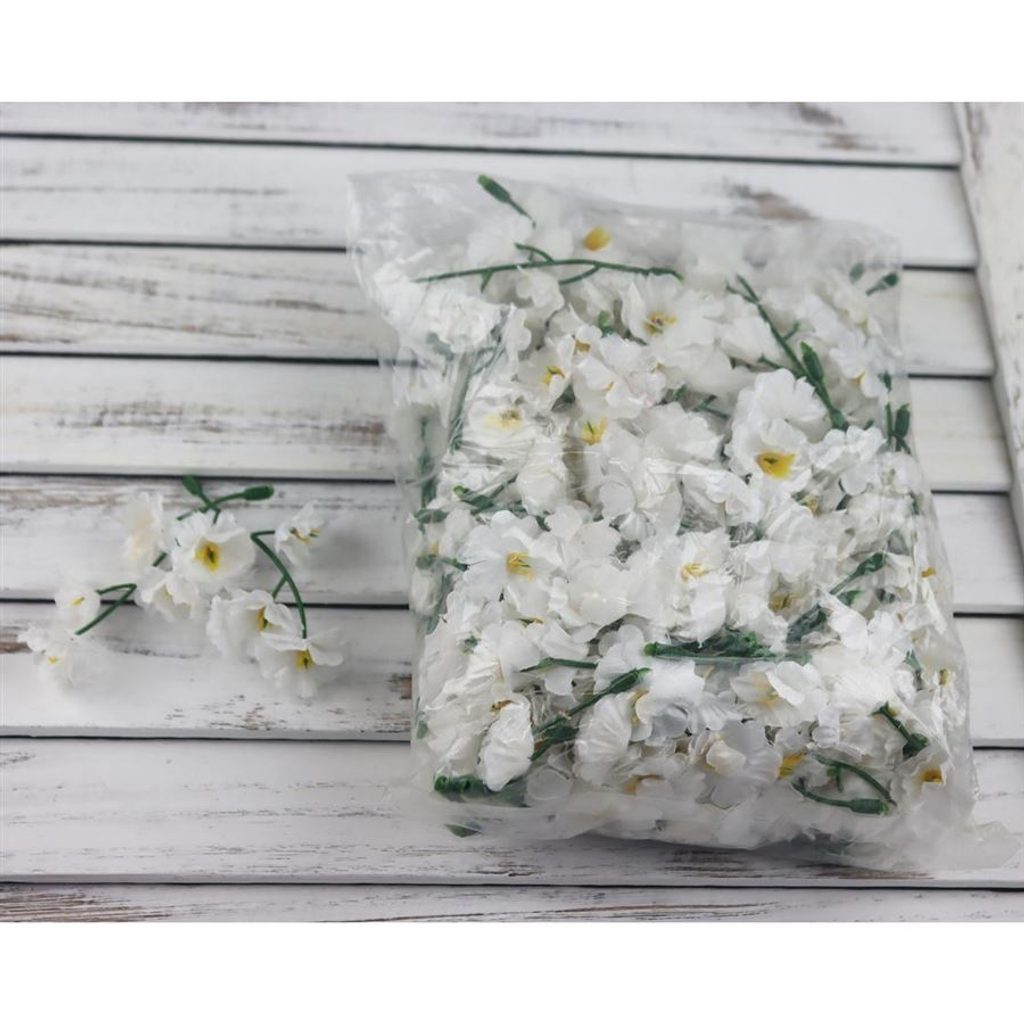 Kytičky Gypsophila v sáčku. Rozměry : 3,5 - 4 x 1,5 cm, celková délka 7,5 - 8 cm. Barva : bílá. Materiál : plast.- Rozměr: 3,5-4 x 1,5 x 7,5-8 cm