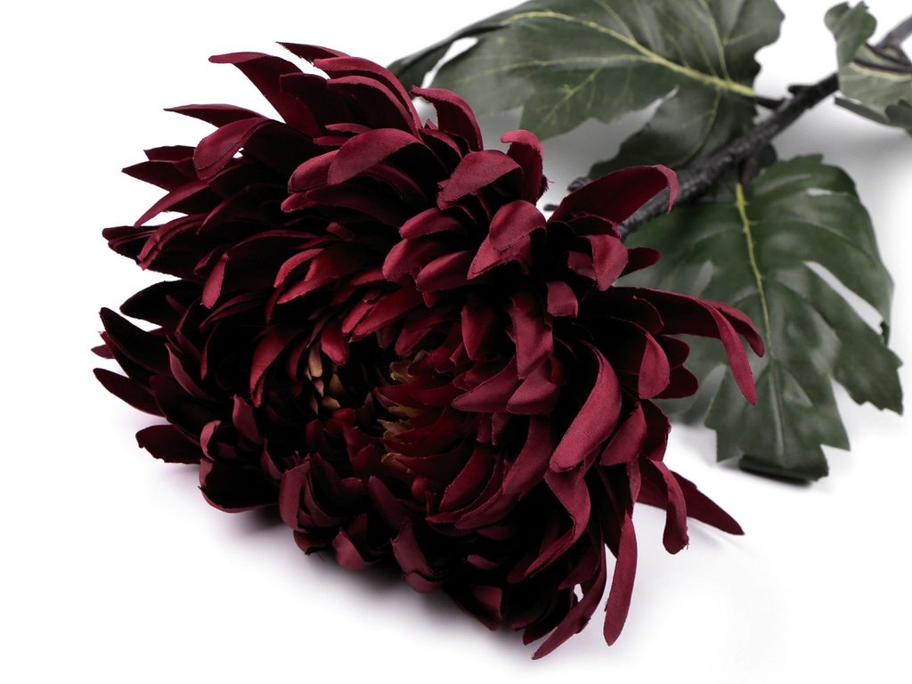 Umělá chryzantéma se pyšní svou velikostí a téměř realistickým zpracováním. Květ a listy jsou textilní. Uvnitř stonku je drát. Chryzantémy vyniknou v jednoduché váze, ale také je využijete k aranžování květinových vazeb, věnců i ikeban.