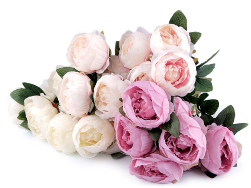 Velká kytice umělých pivoněk vypadá jako živá. Květy a lístky jsou textilní. V jednom svazku je 9 květů, které jsou na ohebném drátku.Použití: Kytice pivoněk vynikne ve váze i na věncích. Jednotlivé květy můžete zakomponovat do věnečků a ozdob do vlasů.