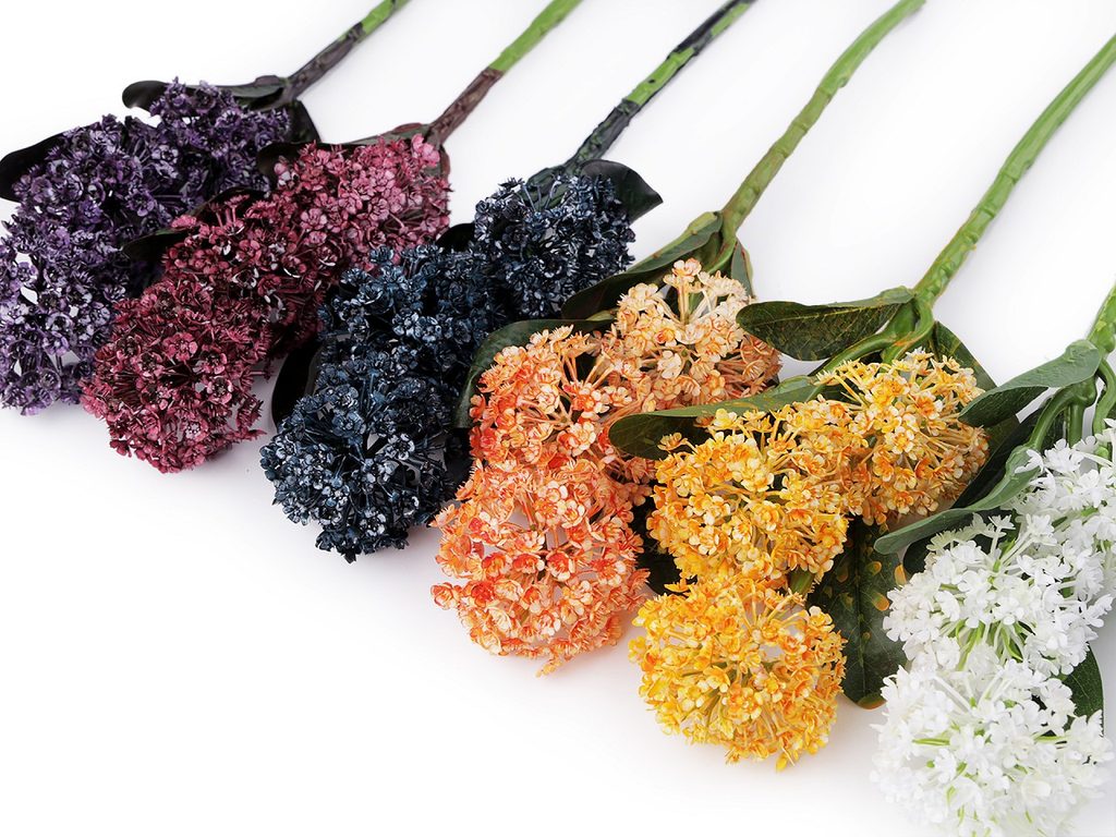 Umělý okrasný česnek zdobí tři kulaté hlavičky květů a textilní listy. Využijete ho na dekorační vazby, ikebany apod., ale vynikne také jednoduše položený ve váze.