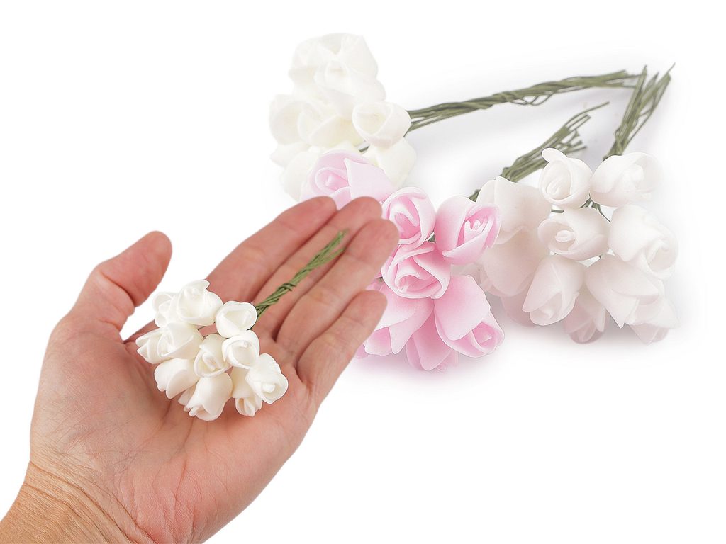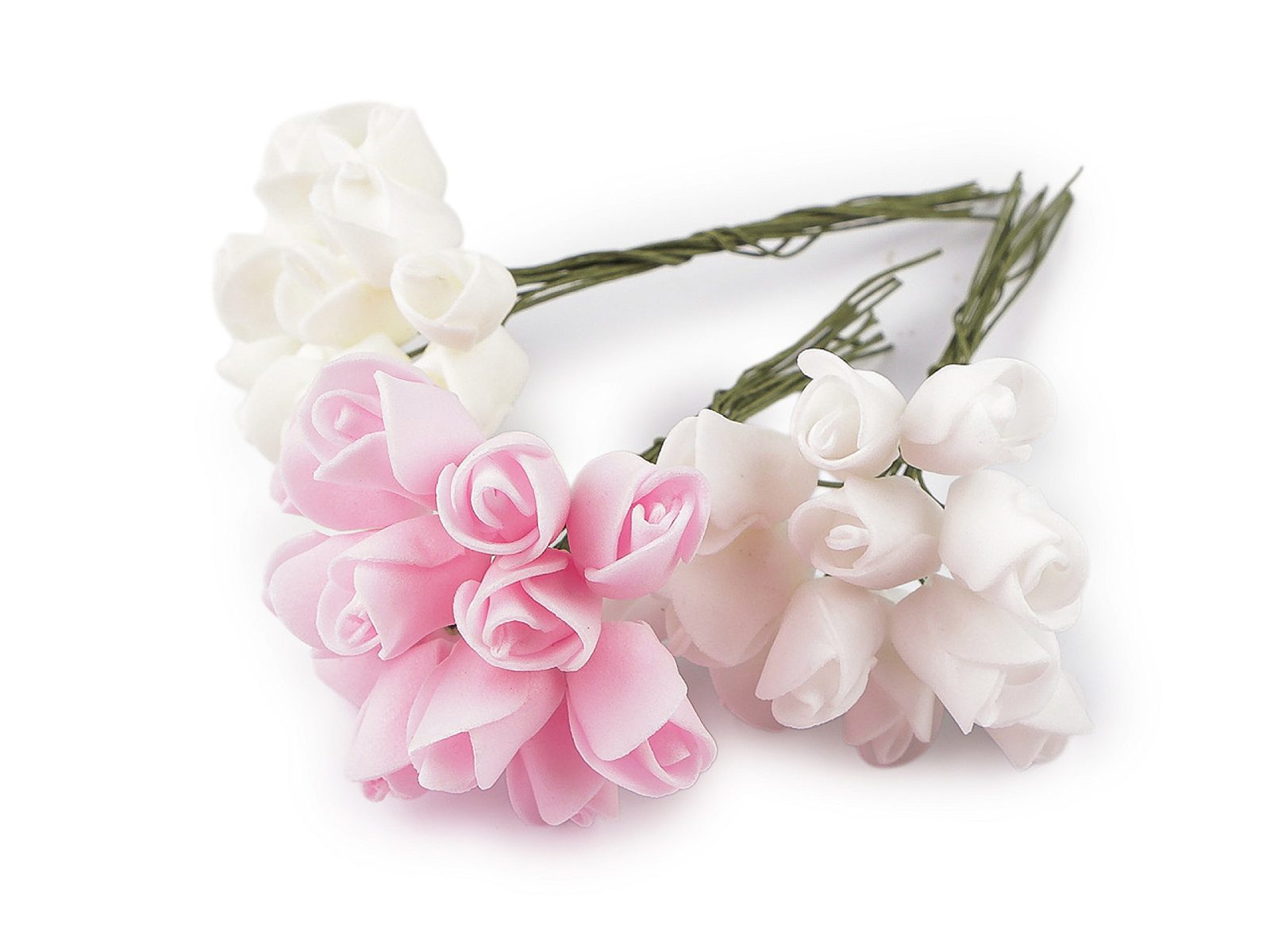 Mini růže jsou vyrobené z pěnové gumy. Drátek, který je jejich součástí, usnadňuje připevnění a manipulaci. Růžičky využijete do svatebních voniček, na věnce i k výrobě různých dekorací a květinových aranžmá.