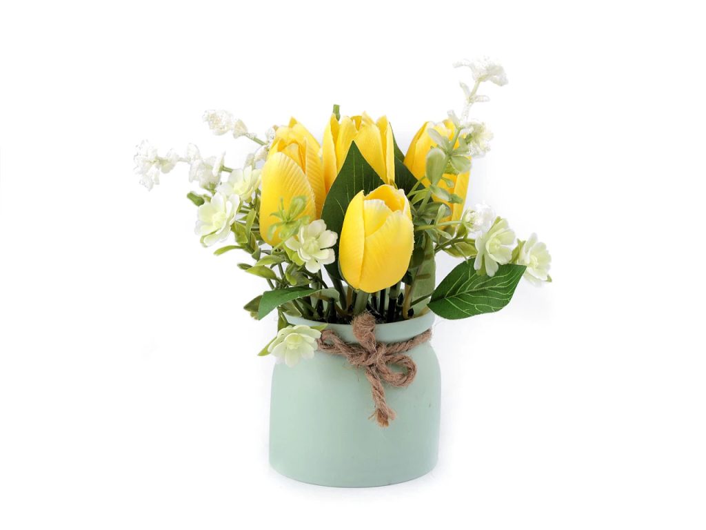 Umělé tulipány v květináči zútulní a rozjasní během jara a velikonočních svátků každý interiér. V květináči je 5 květů tulipánů a další drobné květy. Květináč je plastový, má dobrou stabilitu a zdobí ho jutový provázek.Průměr květu je cca 5,5 cm, jeho délka je cca 5 cm.