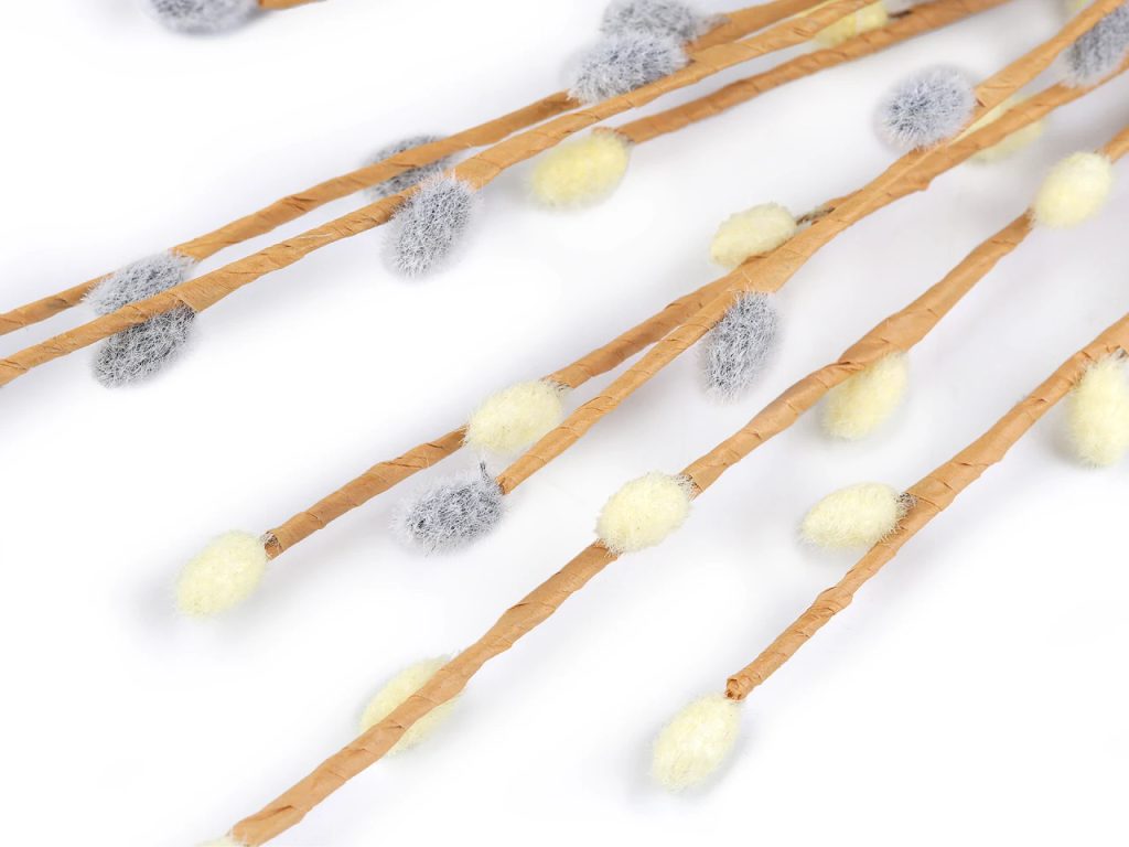 Umělá větvička s kočičkami zkrášlí jarní a velikonoční věnce, aranžmá i květinové vazby. Uvnitř větvičky je drát. Kočičky mají chlupatý povrch, který věrně napodobuje jejich živou předlohu.
