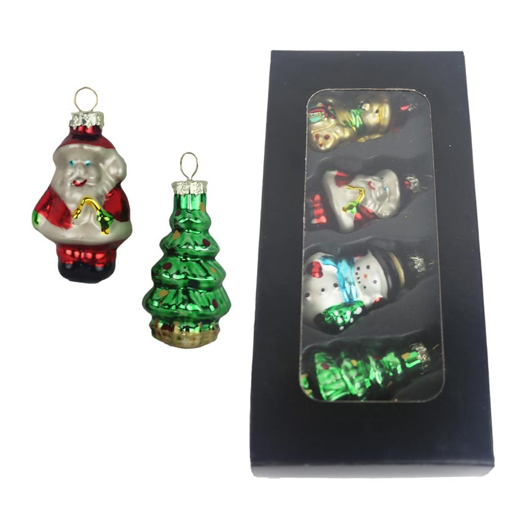 Sada vánočních ozdob. Sada obsahuje 4 ozdoby. Rozměry : 3 x 2,5 cm, výška 5 cm. Barva : kombinace zelená, bílá, zlatá, červená. Materiál : sklo.