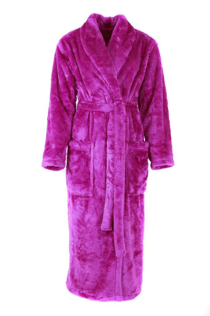 Úžasný huňatý župan od české značky Vestis. Dámský dlouhý župan v oblíbené moderní ostružinové barvě. Župan pro ženy se šálovým límcem, zavazováním v pase a velkými kapsami.