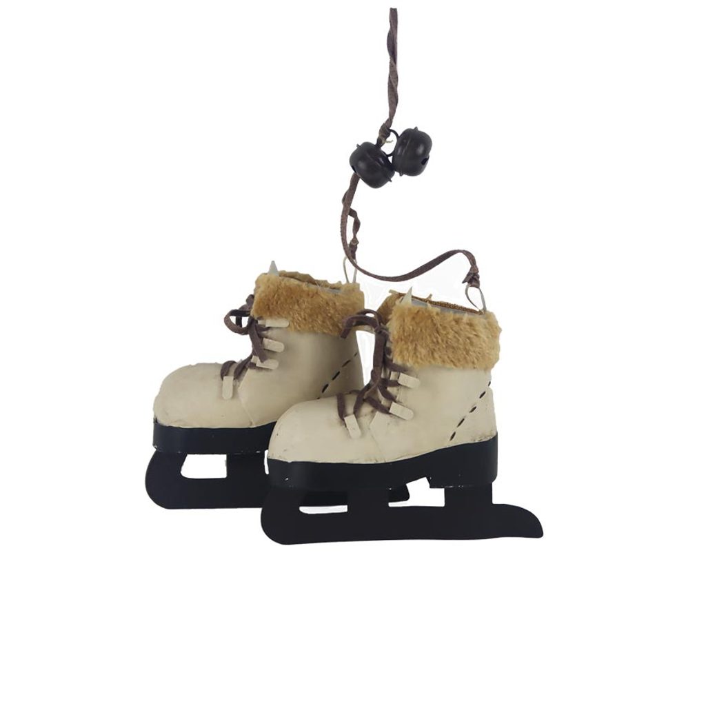 Dekorační brusle k zavěšení. Rozměry : bruslička 14 x 4,5 cm, výška 12,5 cm, dekorace 26 x 4,5 cm, celková délka 30 cm. Barva : kombinace krémová, černá. Materiál : kov.