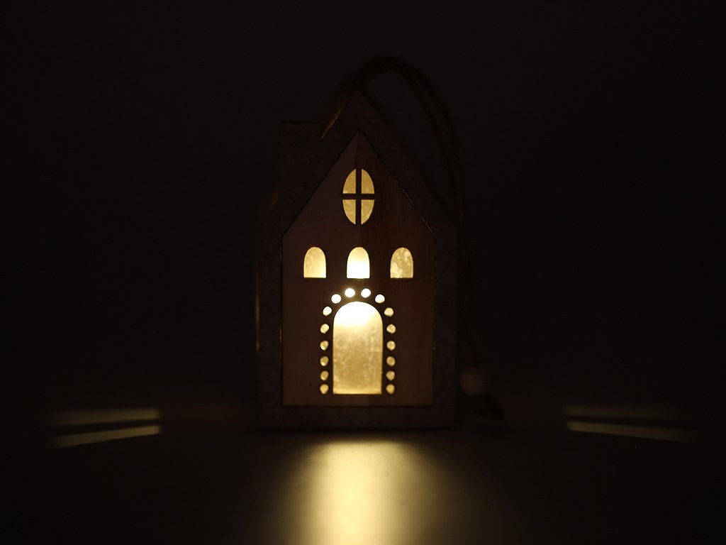 Svítící domeček je vyrobený z kombinace dřeva a pevného filcu. Svítí příjemným teplým světlem, které vypadá jako hvězdička. Díky poutku ho můžete pověsit na větvičky ve váze, na věnce i na vánoční stromeček.Baterie (CR2032) je součástí balení.