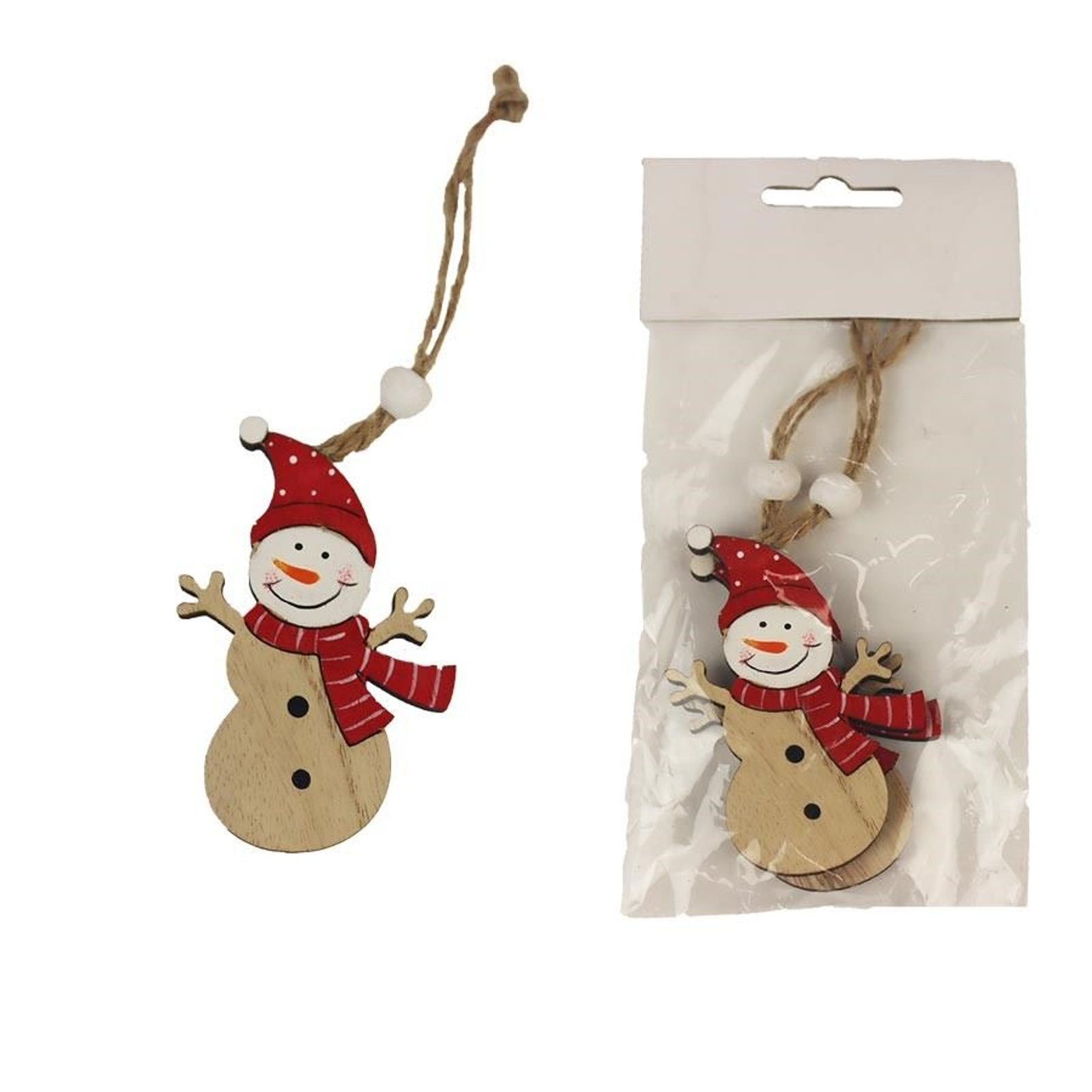 Dekorační sněhulák k zavěšení. Rozměry : 5 x 0,5 cm, výška 7,5 cm. Barva : kombinace přírodní s červenou. Materiál na bázi dřeva.Rozměr: 5 x 0,5 x 7…