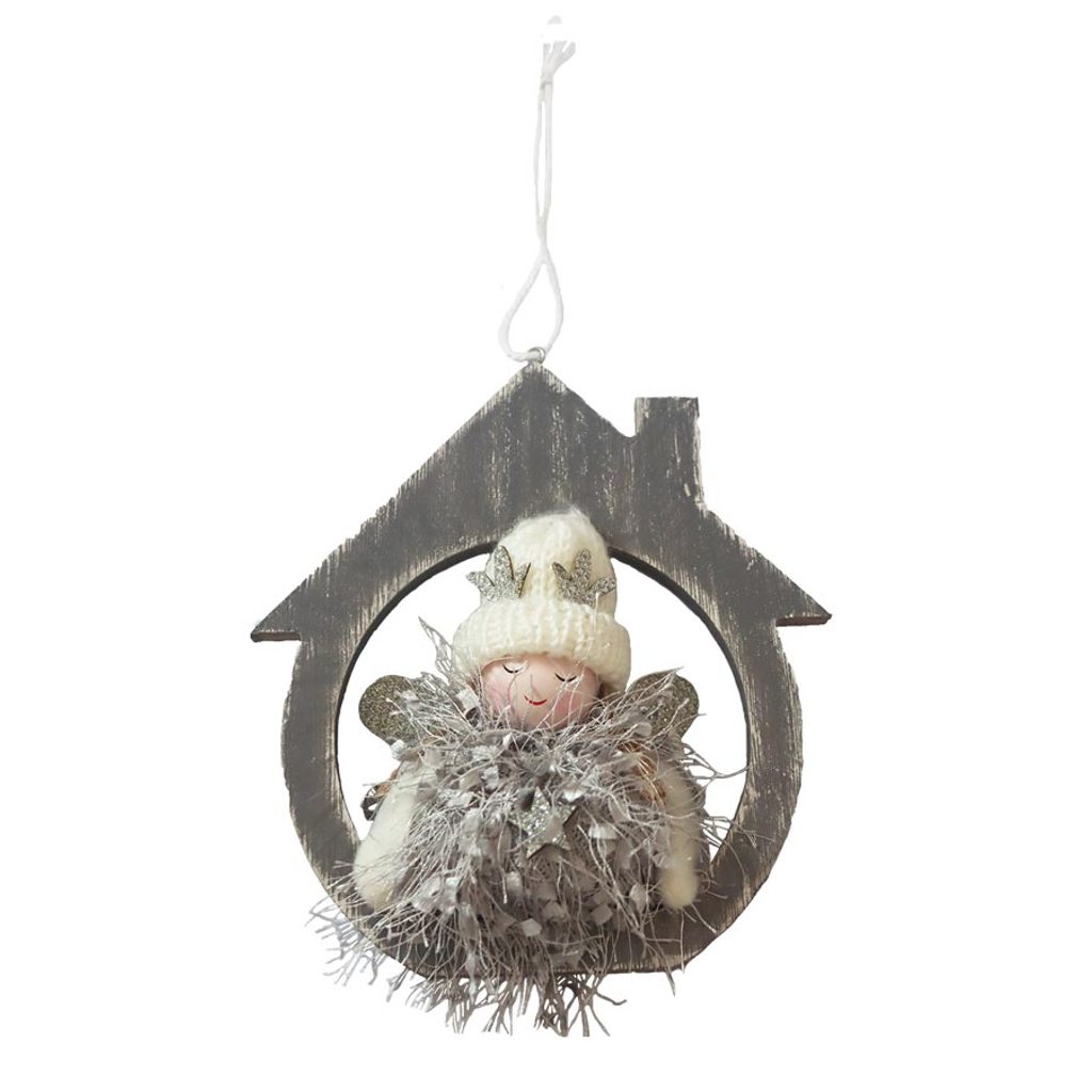 Vánoční dekorace k zavěšení s andílkem. Rozměry : 14 × 5.5 cm, tloušťka 4 cm. Barva : šedá. Materiál na bázi dřeva, textil.Rozměr: 14 × 4 × 15.5 cm