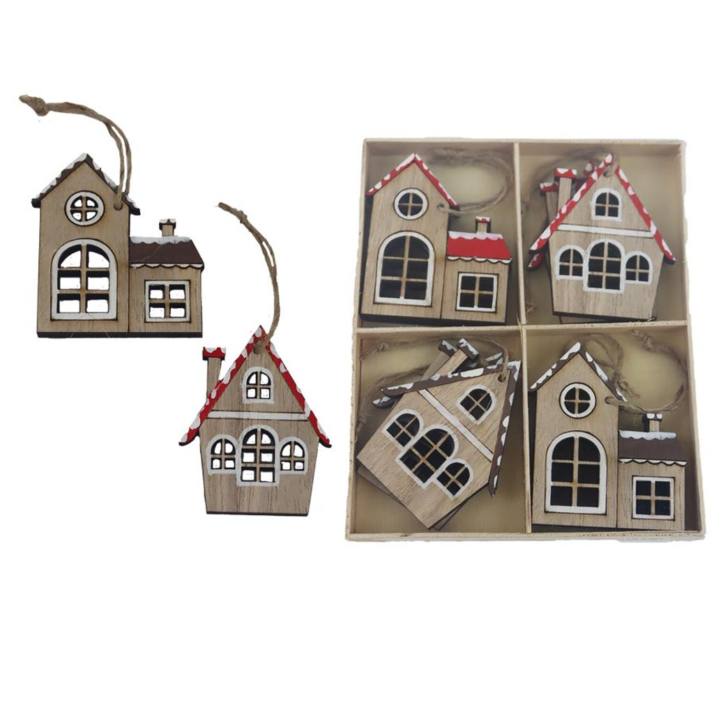 Sada dekoračních domečků k zavěšení. Sada obsahuje 8 domečků. Rozměry : 4,7 x 0,5 x 5,8 cm. Barva : kombinace hnědá, červená. Materiál na bázi dřeva.