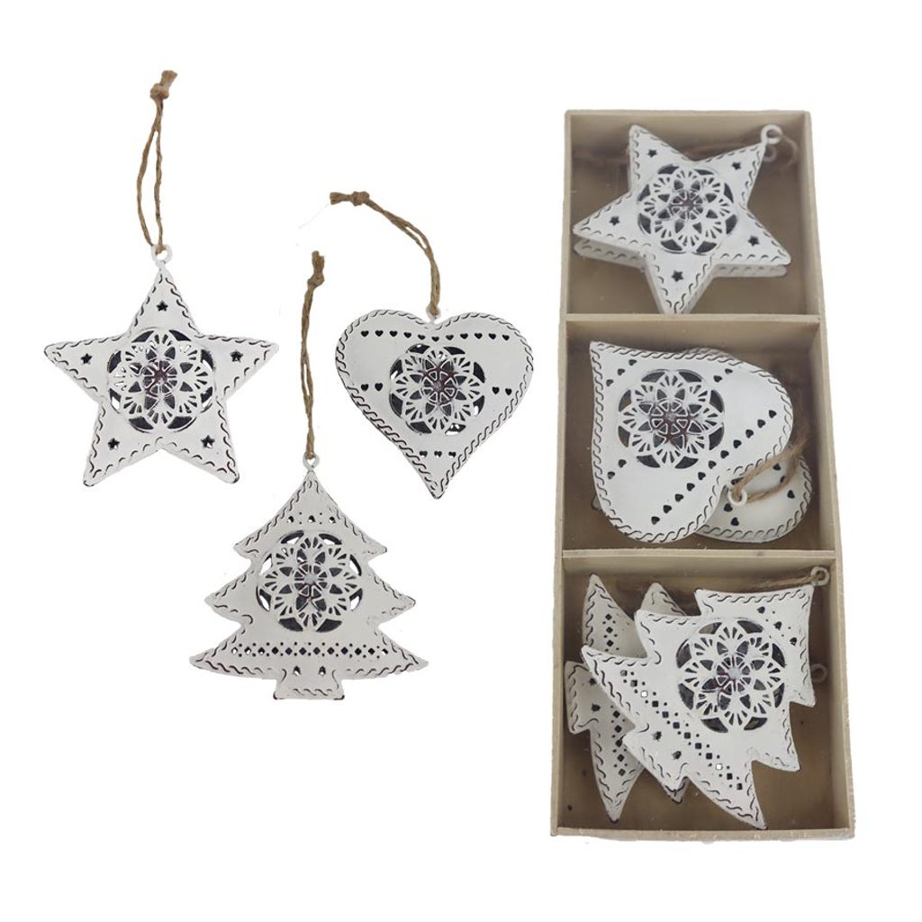 Sada dekorací k zavěšení. Sada obsahuje 6 dekorací. Rozměry : 6,5 - 7 x 1 cm, výška 6,5 - 8 cm. Barva : bílá patina. Materiál : kov.