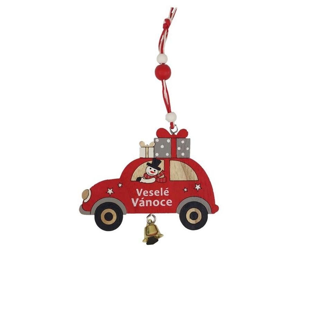 Dekorace k zavěšení - autíčko. Rozměry : 9,3 x 0,5 cm, výška 8 cm, celková délka 16 cm. Barva : kombinace červená, šedá, bílá, černá. Materiál na bázi dřeva.