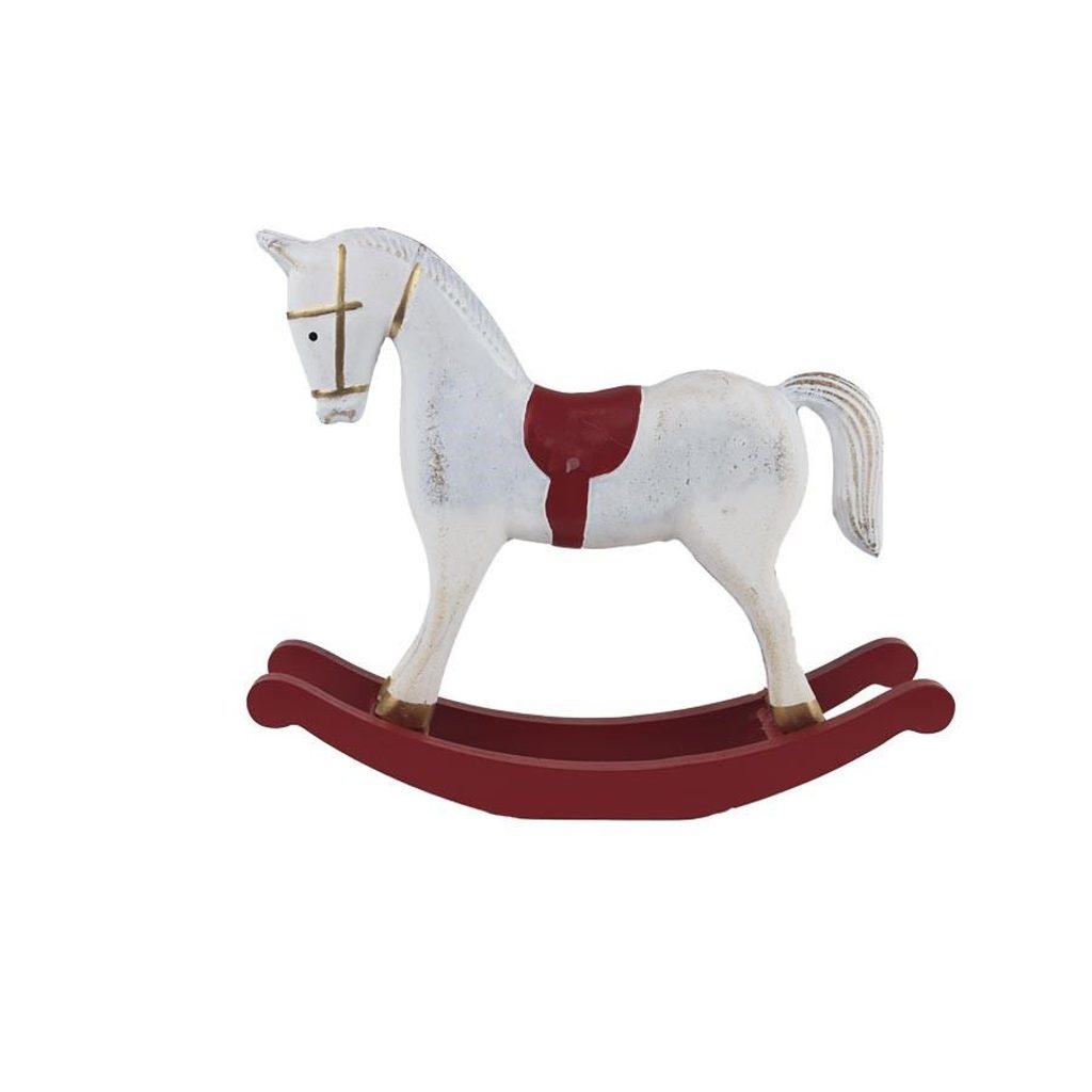 Dekorační houpací koníček. Rozměry : 11 × 4,5 cm, výška 14 cm. Barva : kombinace bílá s červenou. Materiál na bázi dřeva.Rozměr: 11 × 4.5 x 14 cm