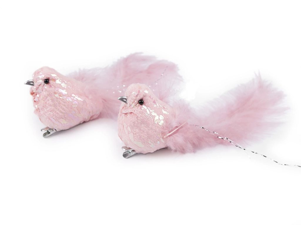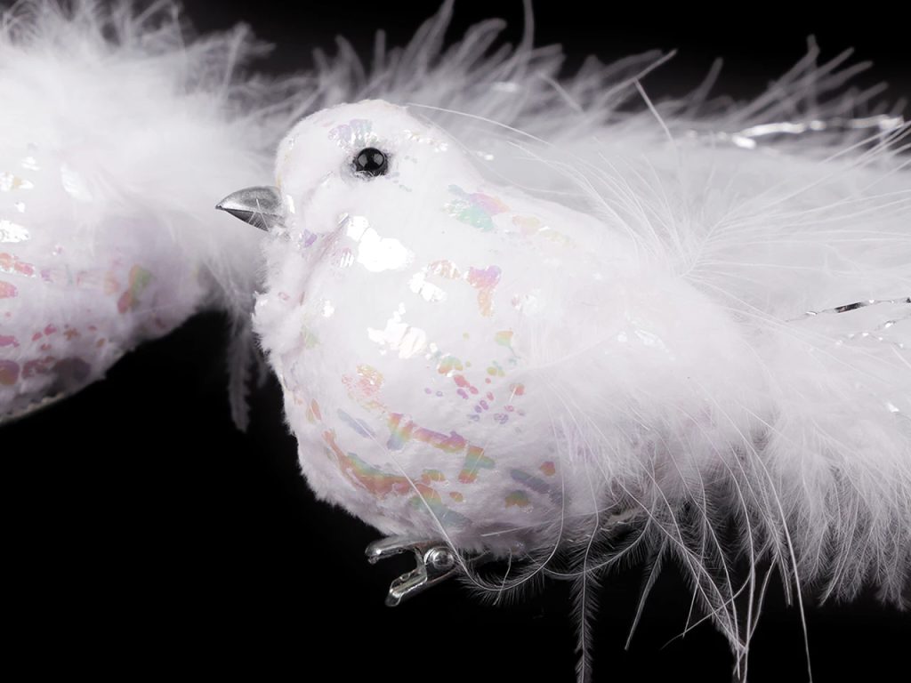 Dekorační ptáček působí něžně a romanticky. Tělo má pokryté jemným plyšem a najdete na něm i odlesky s AB efektem. Zespodu má připevněnou kovovou sponu, díky které můžete ptáčka připevnit například na věnec, větvičku, záclonu či ho naaranžovat do květinových vazeb.
