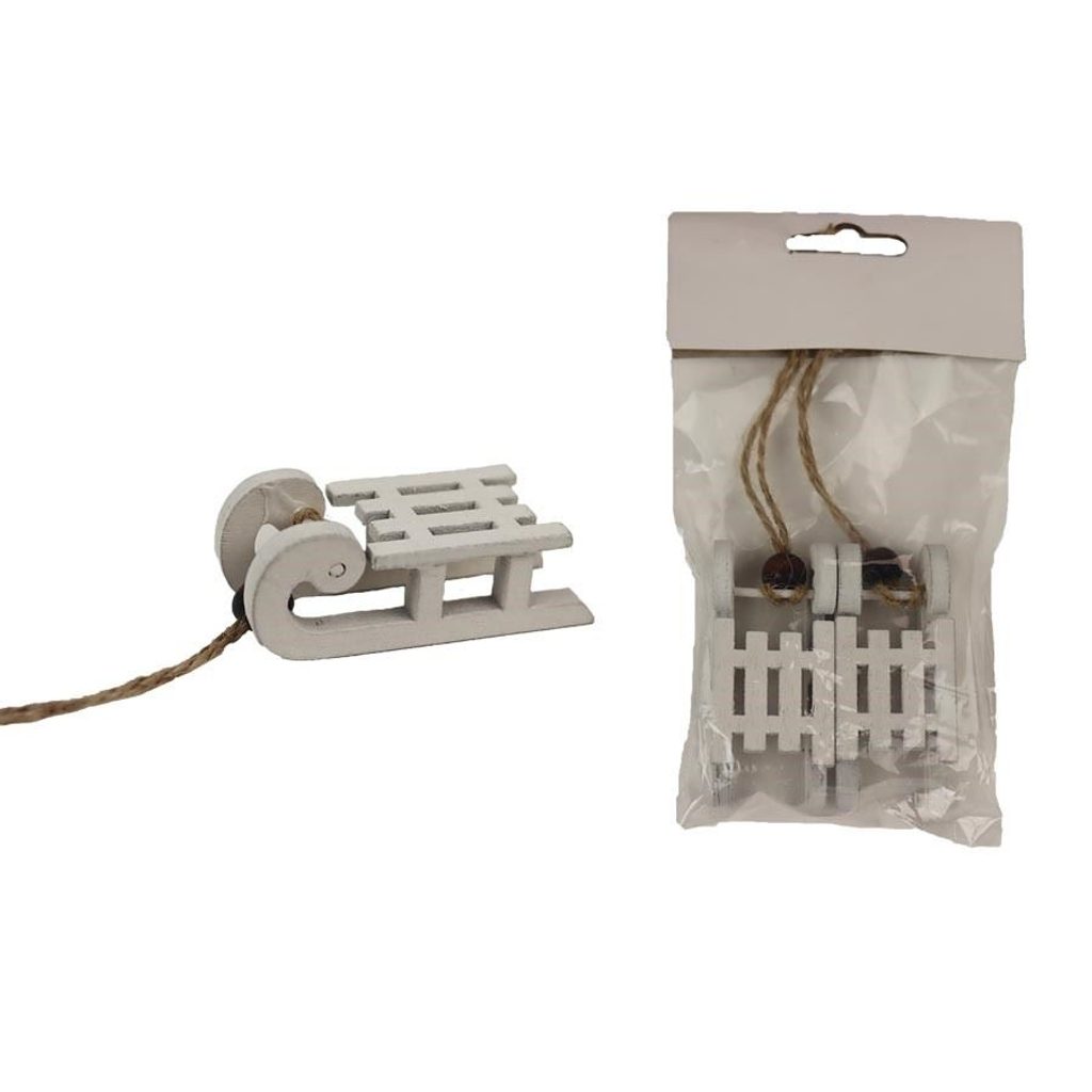 Sada dekoračních sáněk. Sada obsahuje 2 sáňky. Rozměry : 6,2 x 2,8 cm, výška 2,5 cm. Barva : bílé. Materiál na bázi dřeva.