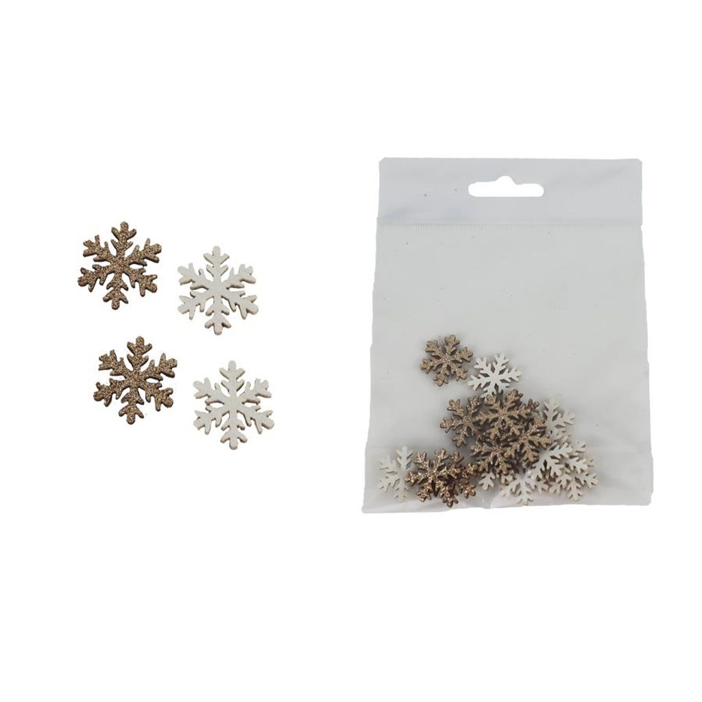 Sada dekoračních vloček. Sada obsahuje 16 vloček. Rozměry : průměr 2 cm, tloušťka 0,2 cm. Barva : kombinace zlatá, bílá. Materiál na bázi dřeva.