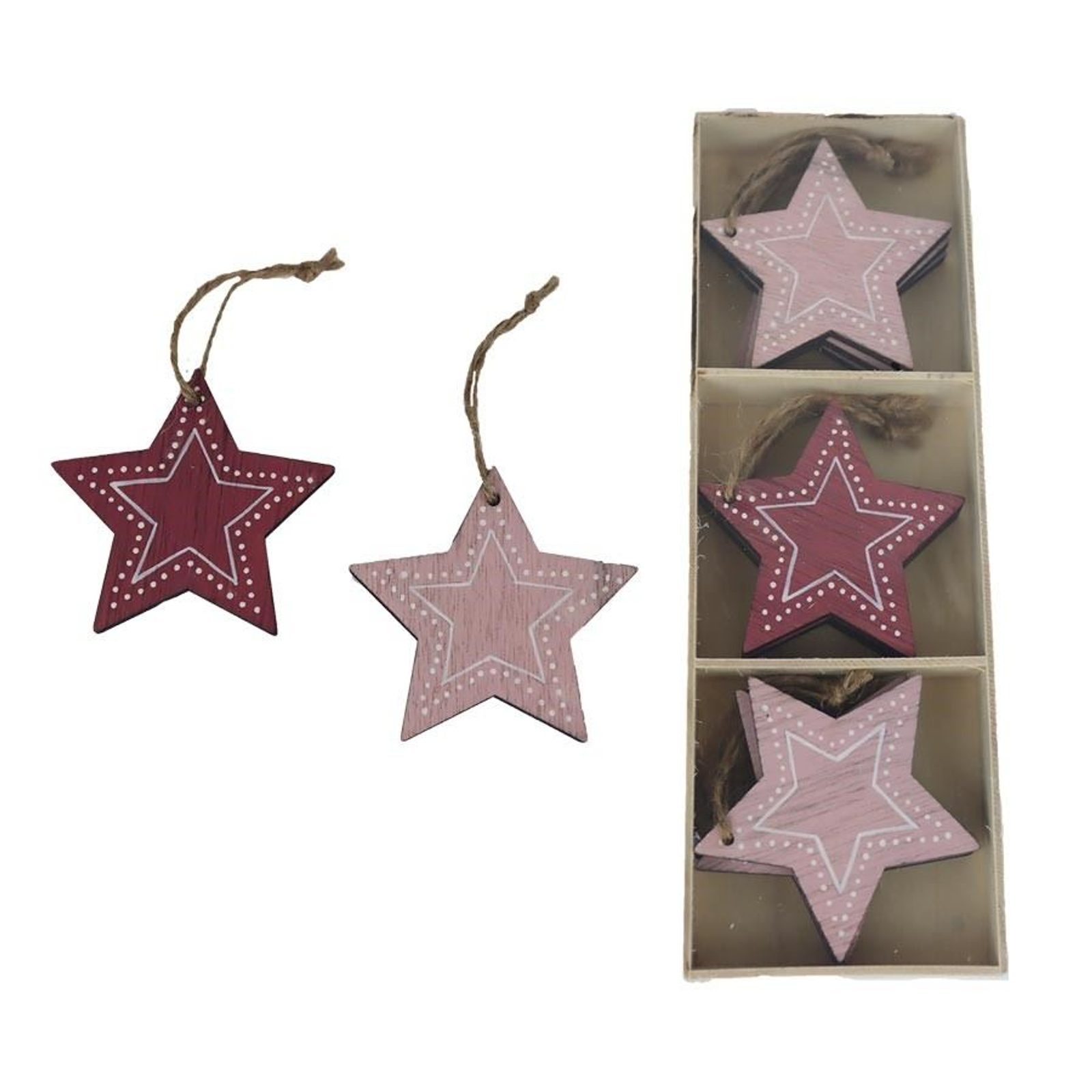 Sada dekoračních hvězdiček k zavěšení. Sada obsahuje 9 hvězdiček. Rozměry : 6,5 x 6,5 cm, tloušťka 0,4 cm. Barva : růžová. Materiál na bázi dřeva.