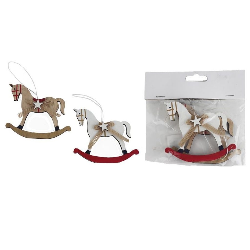Sada dekoračních koníků k zavěšení. Sada obsahuje 2 koníky. Rozměry : 9,5 x 8,5 cm, tloušťka 1 cm. Barva : bílá, přírodní, červená. Materiál na bázi dřeva, textil.