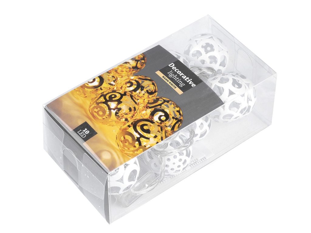 Na světelném řetězu najdete 10 LED diod, které jsou schované v kovových děrovaných kuličkách. Rozestup mezi jednotlivými kuličkami je 15 cm. Řetěz svítí, nebliká.Řetěz je na 2 kusy AA baterií, které nejsou součástí. Je určený na vnitřní použití.