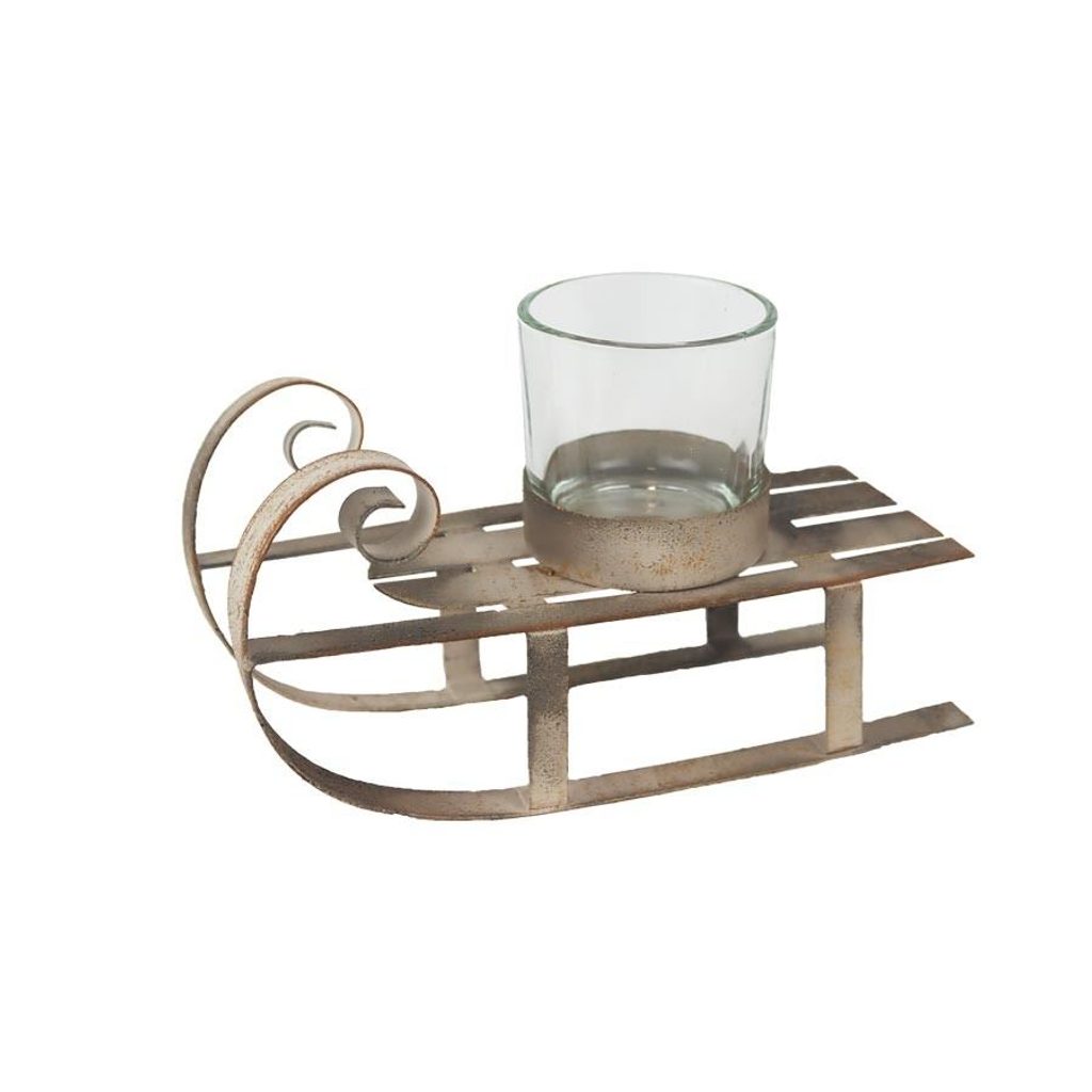Dekorační svícen sáňky. Rozměry : 15,5 x 6,5 cm, výška 6 cm. Barva : hnědo zlatá. Materiál : kov, sklo.Rozměr: 15,5 × 6,5 × 6 cm