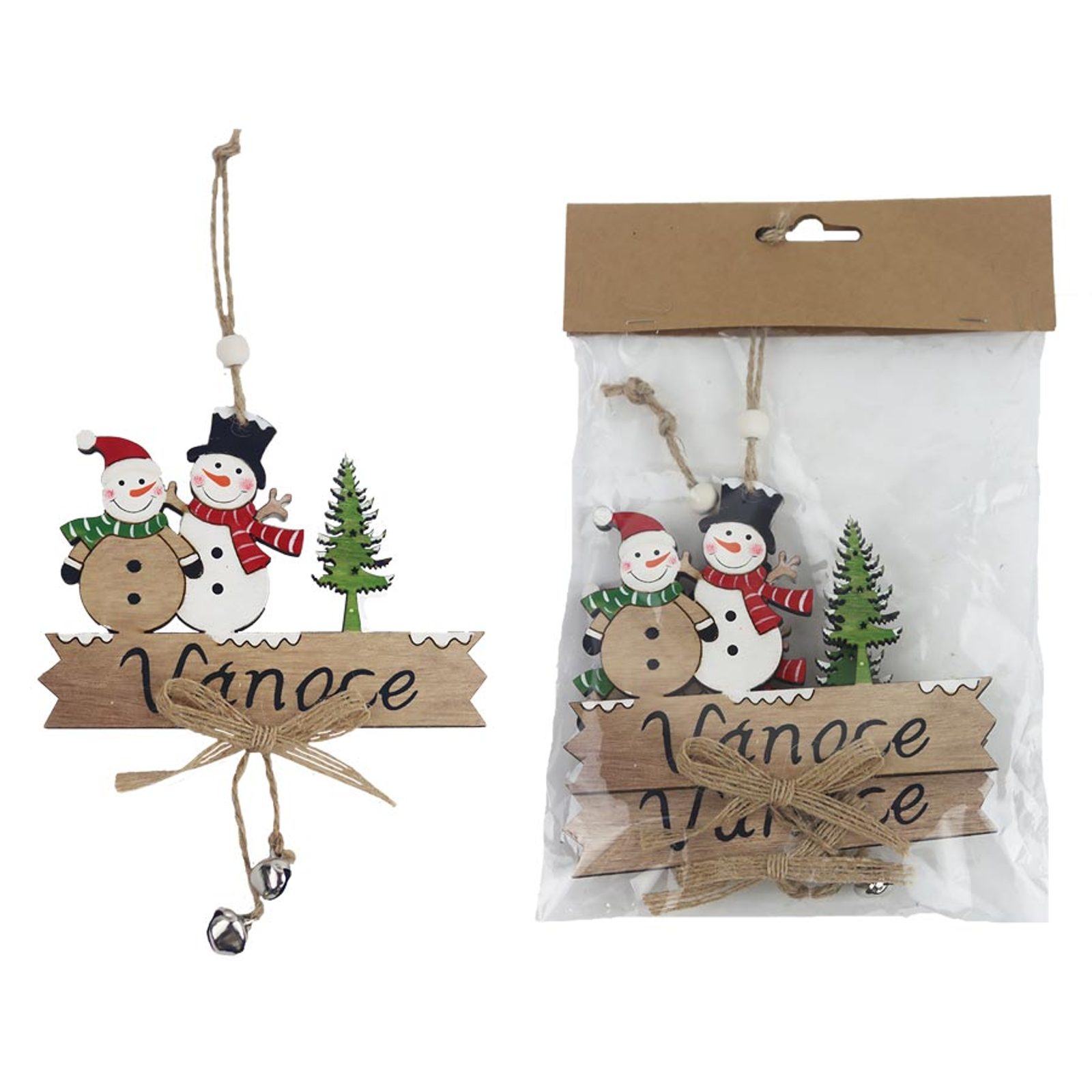 Vánoční dekorace k zavěšení. Rozměry : 12,7 x 0,5 cm, výška 10 cm, celková délka dekorace 24 cm. Barva : kombinace hnědá, bílá, zelená, červená. Materiál na bázi dřeva.