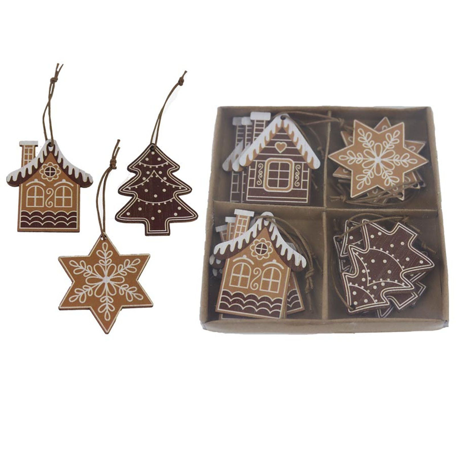 Sada vánočních dekorací k zavěšení. Sada obsahuje 12 dekorací - mix. Rozměry : 4,5 - 4,7 x 0,2 cm, výška 5,5 cm. Barva : kombinace hnědá s bílou. Materiál na bázi dřeva.