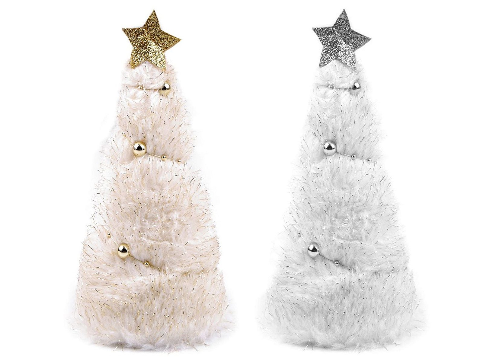 Dekorační stromeček zdobí umělá kožešinka s lurexem a korálky. Na špičce se třpytí glitrová hvězda.Stromeček vynikne na sváteční tabuli a zakomponovaný v různých vánočních a zimních aranžmá.