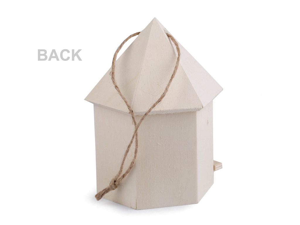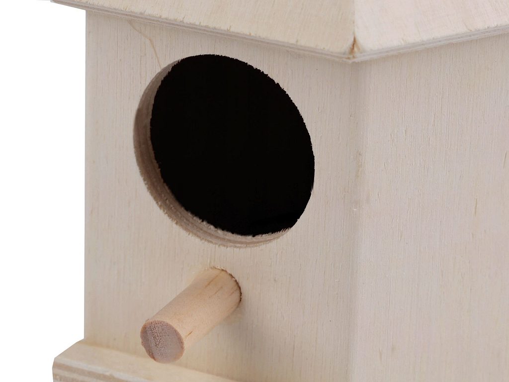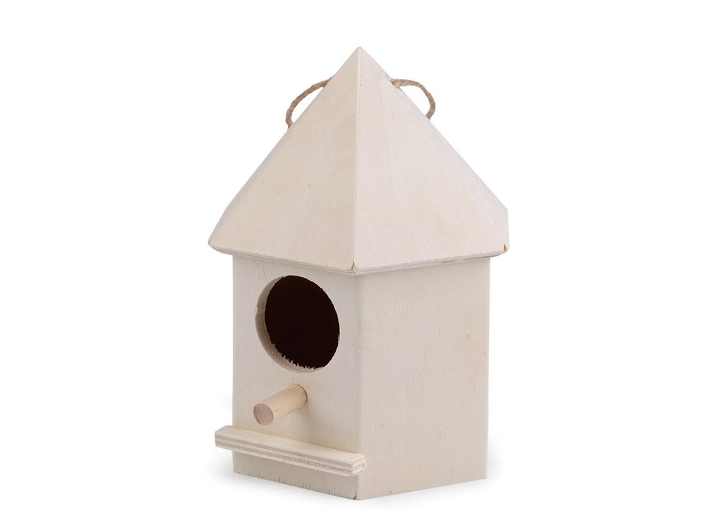 Dřevěná ptačí budka ozdobí terasu, balkón i stromy v zahradě. Díky poutku ji pověsíte kamkoliv. Můžete ji použít jako samostatnou dekoraci nebo dozdobit. Dá se domalovat akrylovými či temperovými barvami, popisovači, glitrovými lepidly, technikou decoupage aj.Průměr otvoru je 3,3 cm.