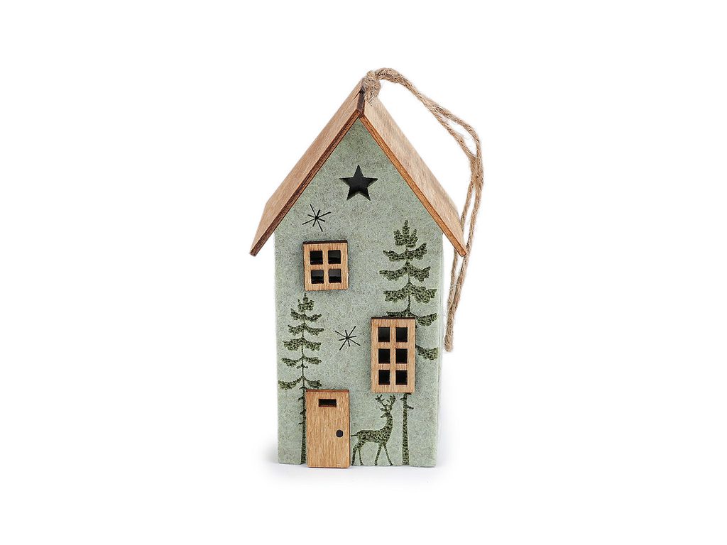 Dřevěný domeček má precizně zpracované výřezy. Doladí vám poličky, sváteční tabuli a díky poutku ho můžete pověsit i na stromeček nebo dekorační věnce.